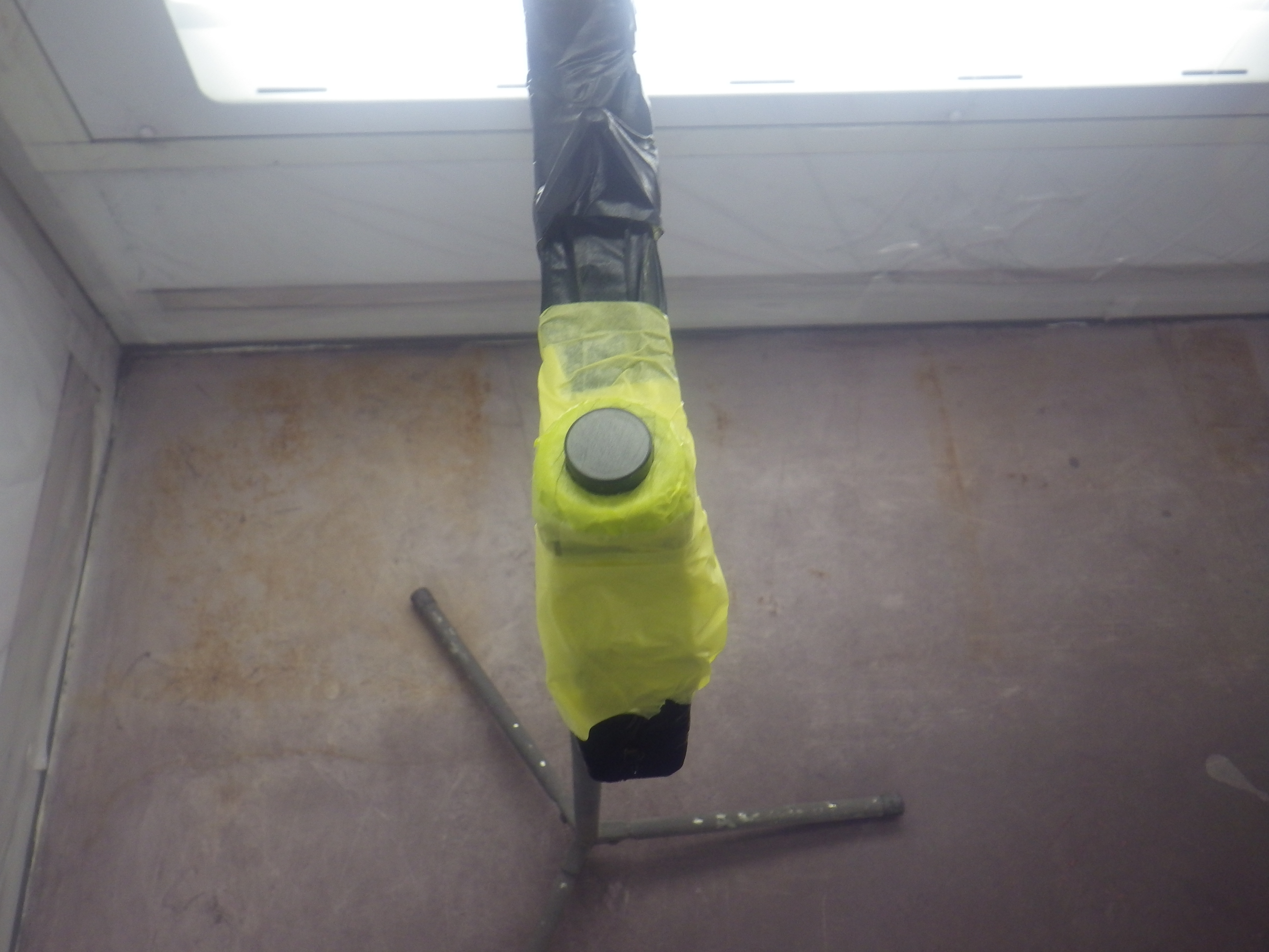 分解作業の後、塗装準備(足付け、マスキング、脱脂、エアブロー)を行い、