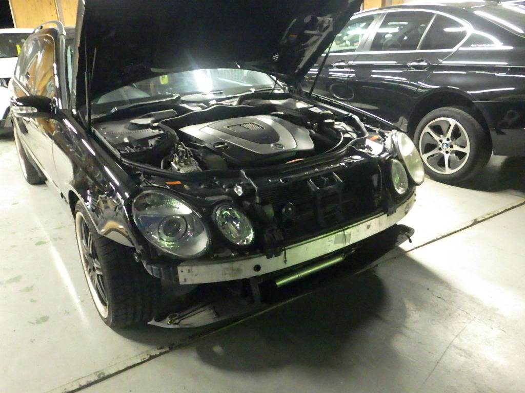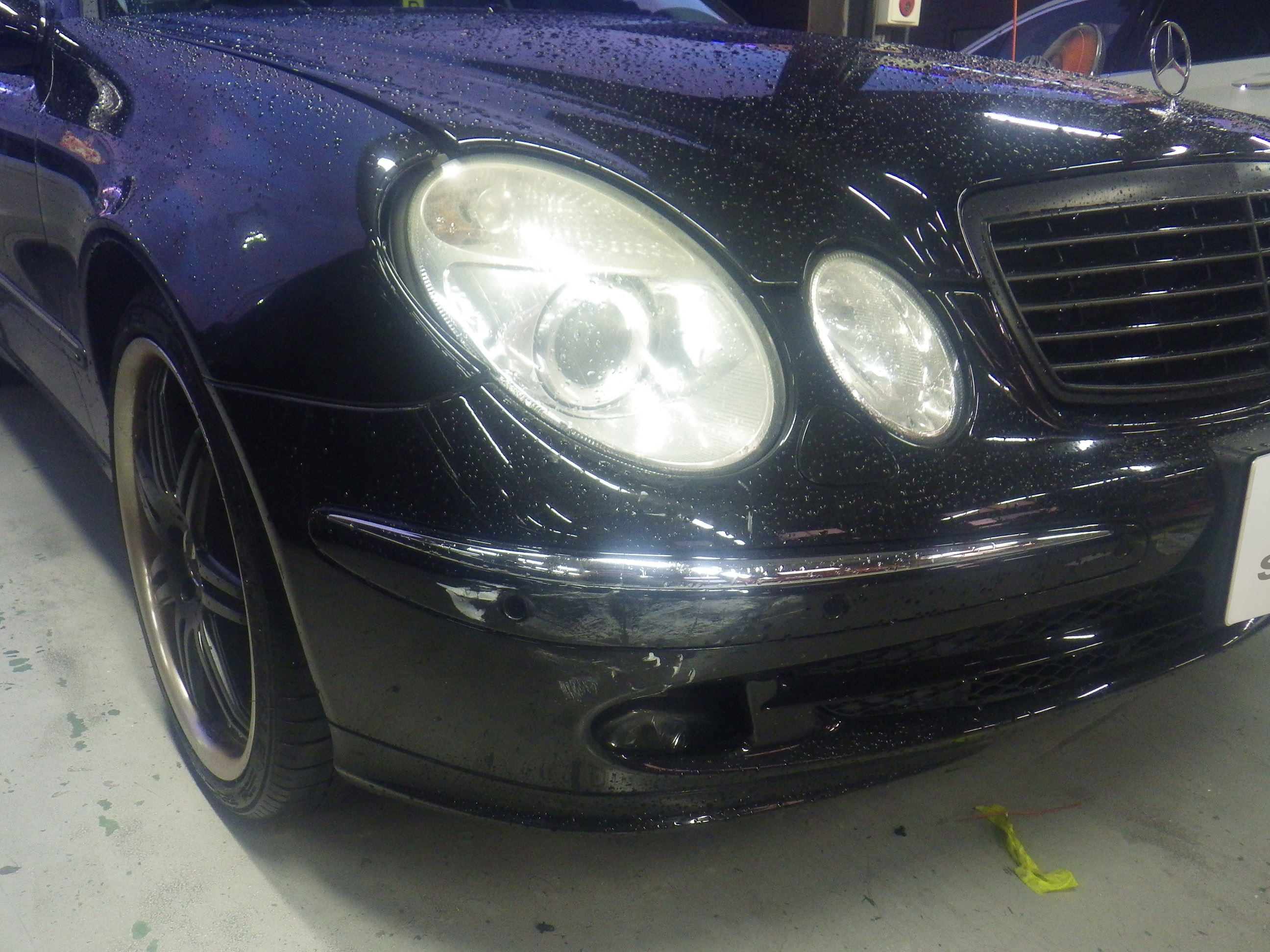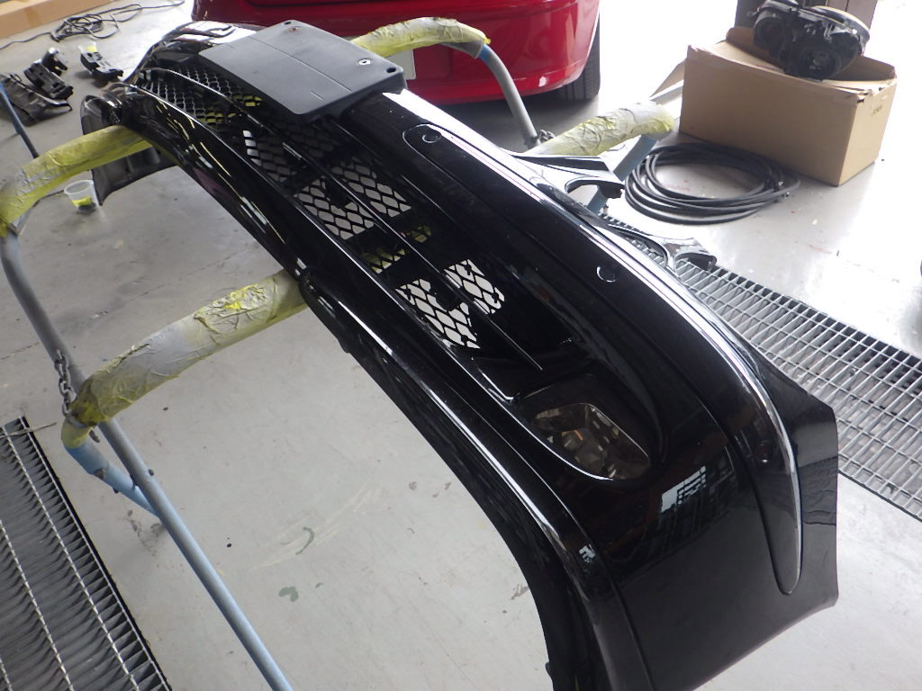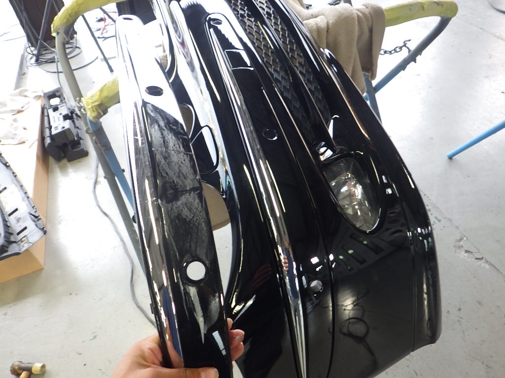 分解作業の後、新品パネル、中古ヘッドライト、新品バンパーの順に仮合わせ作業を行いました。
