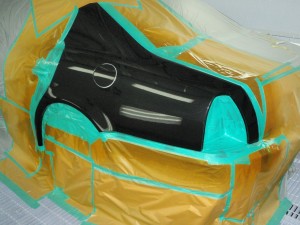 下地処理完了後、塗装ブース内に入れ、塗装時のミスト・塗膜の欠陥防止の為、養生作業、脱脂作業を行い塗装開始です。