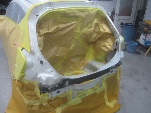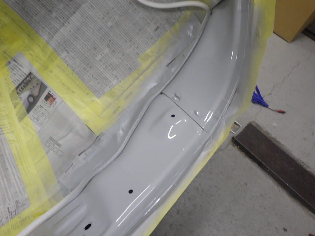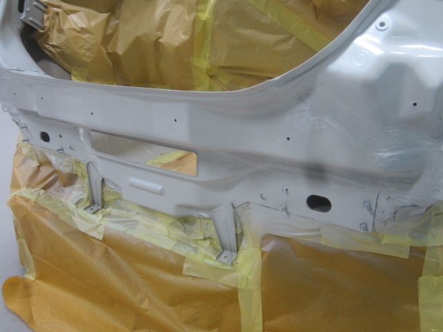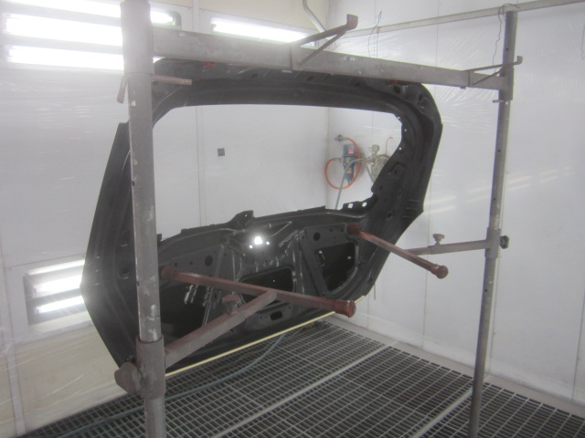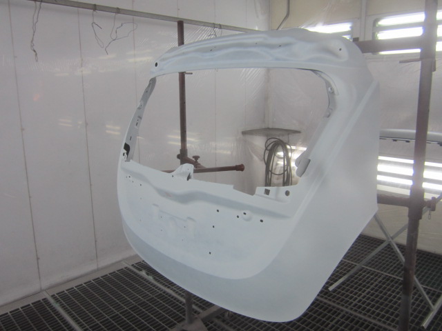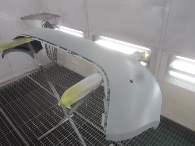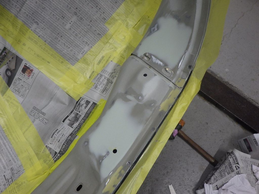 その後、パテ修正作業を行い、塗装準備(足付け、マスキング、脱脂、エアブロー)を行い、サフェーサーの塗布作業を行いました。