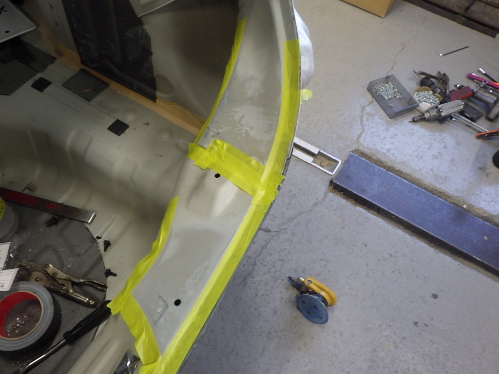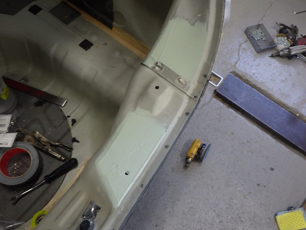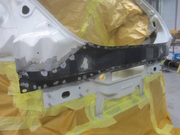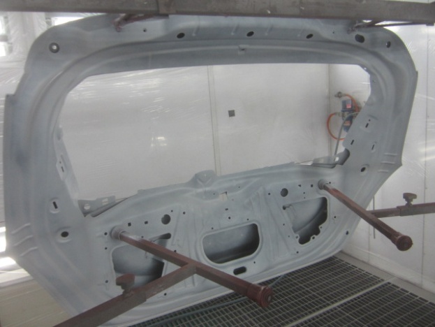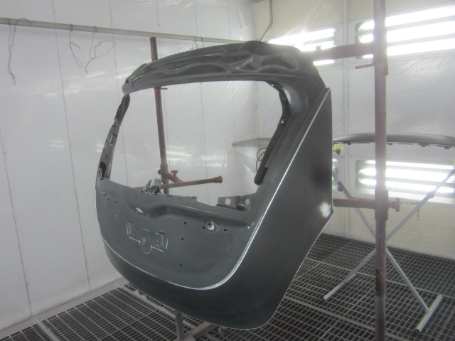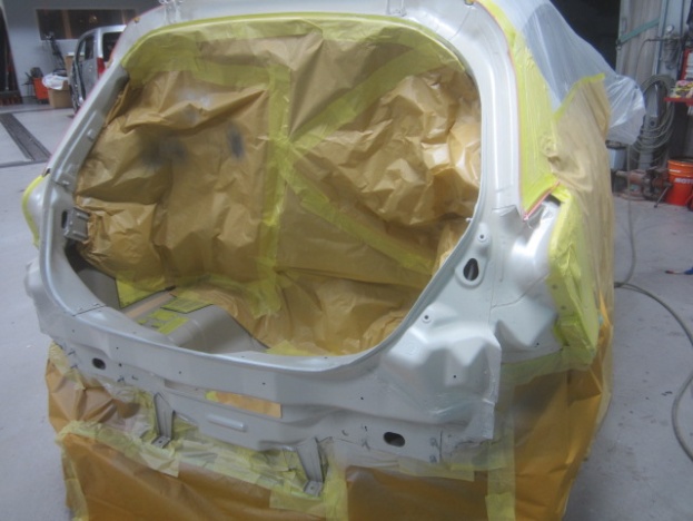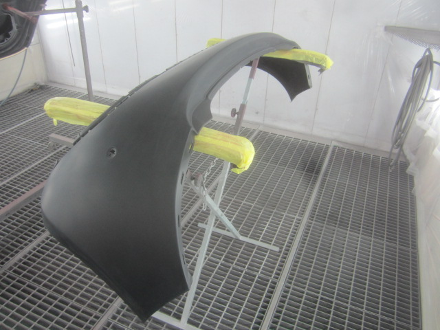 その後、パテ修正作業を行い、塗装準備(足付け、マスキング、脱脂、エアブロー)を行い、サフェーサーの塗布作業を行いました。