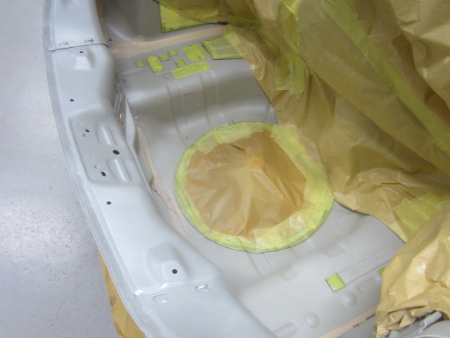 サフェーサー乾燥の後、足付け作業、マスキング作業、脱脂作業、エアブローを行い、
