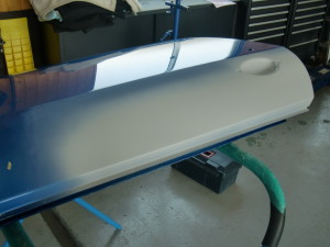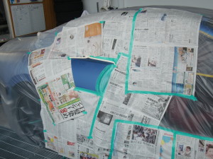 サフェーサー乾燥の後、足付け作業、マスキング作業、脱脂作業、