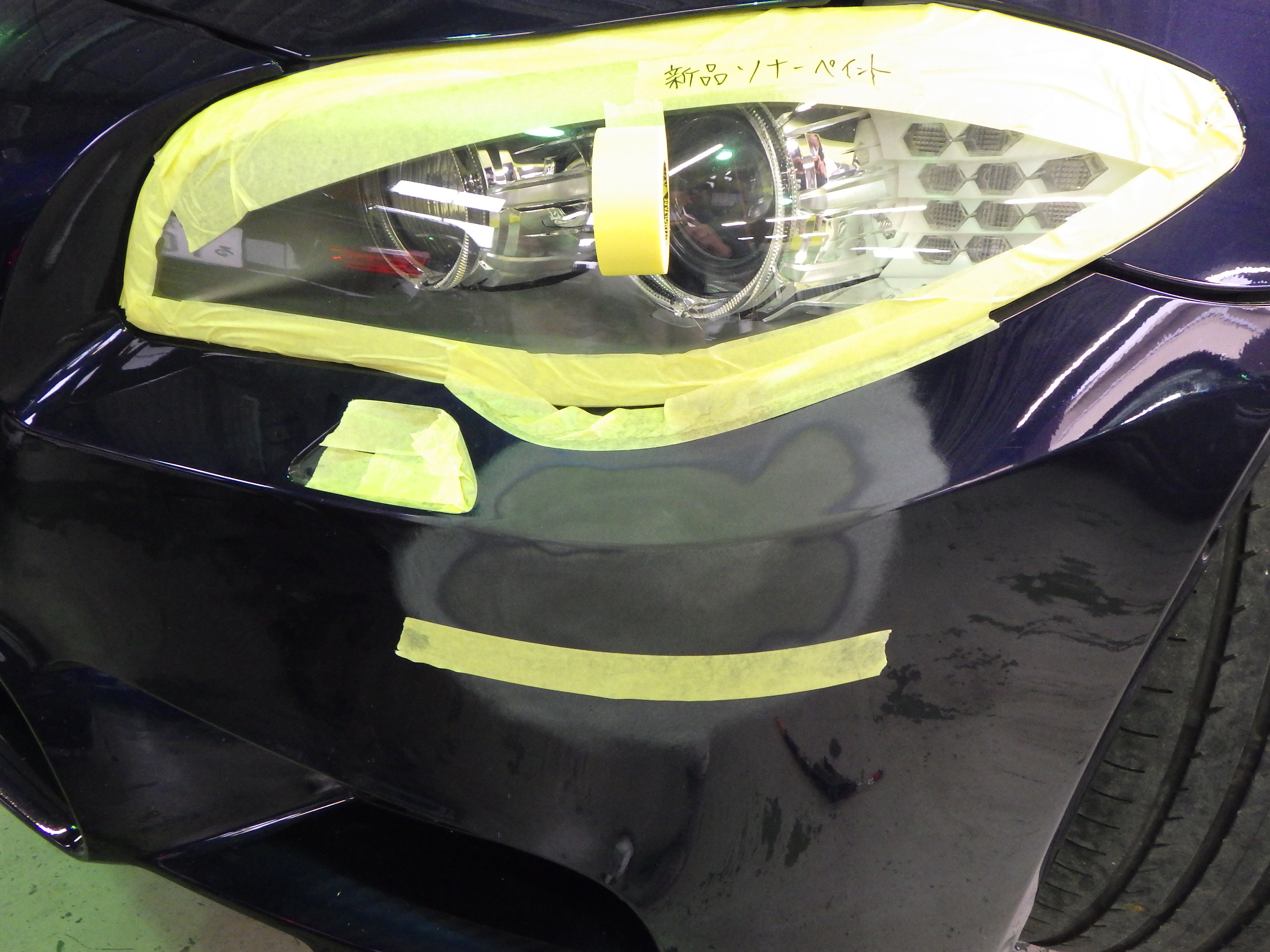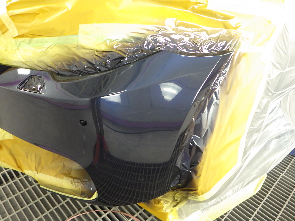 サフェーサーの塗布作業の後、ペイント用意(足付け、マスキング、脱脂、エアブロー)を行い、ベースコート(紺)、トップコート(クリヤー)の順に塗装作業を行いました。