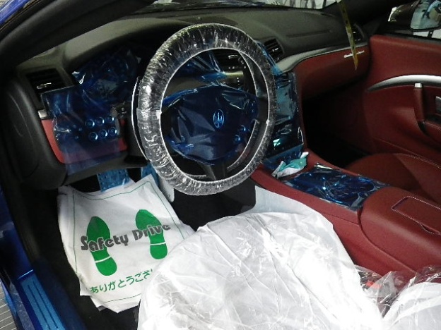 入庫確認作業の後、キズ、汚れ防止の為、シートカバー、ハンドルカバー、保護テープの貼り付け作業を行いました。