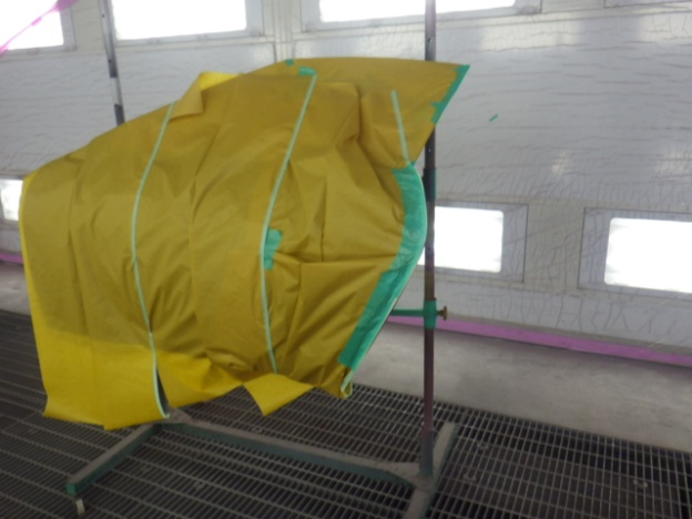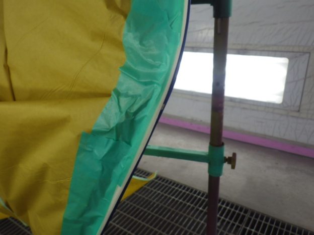 修正作業を行った後、マスキング作業、脱脂作業、エアブローを行い、塗装作業を行いました。