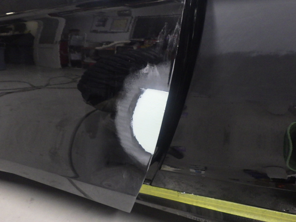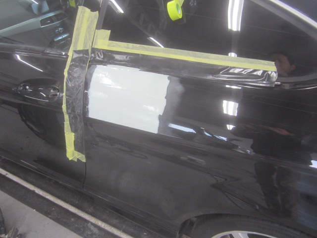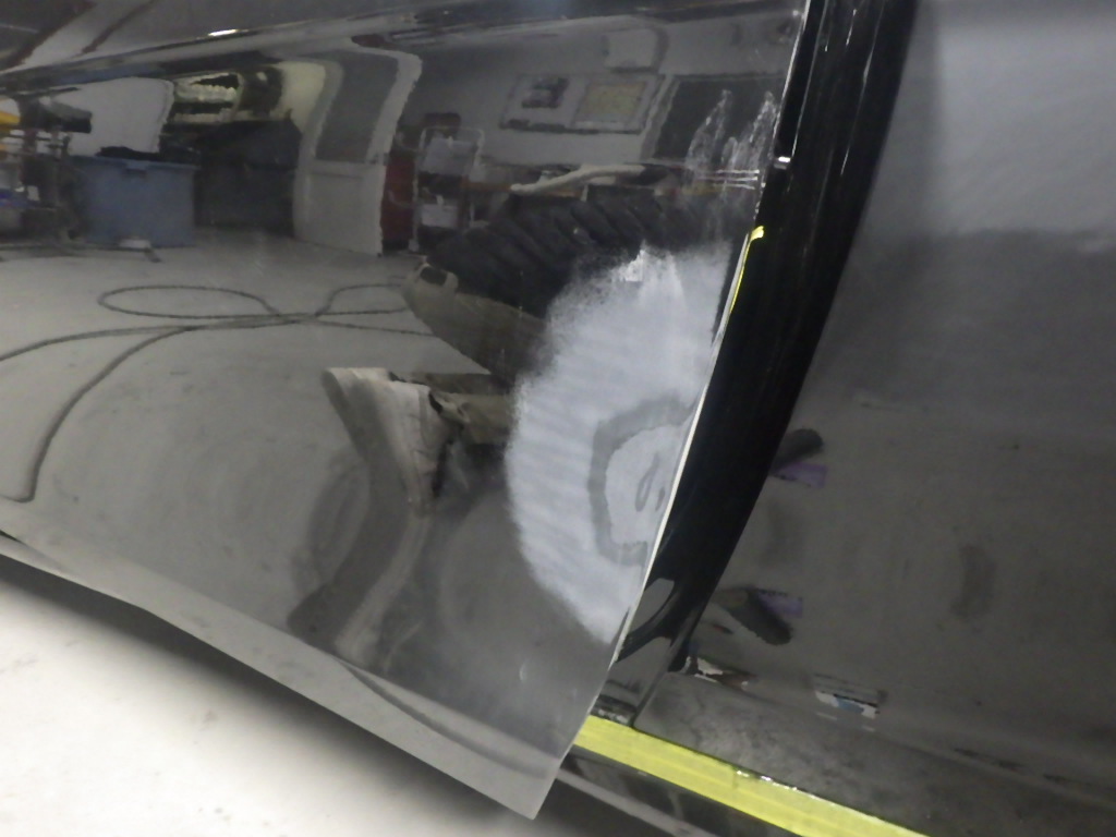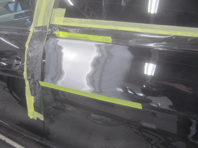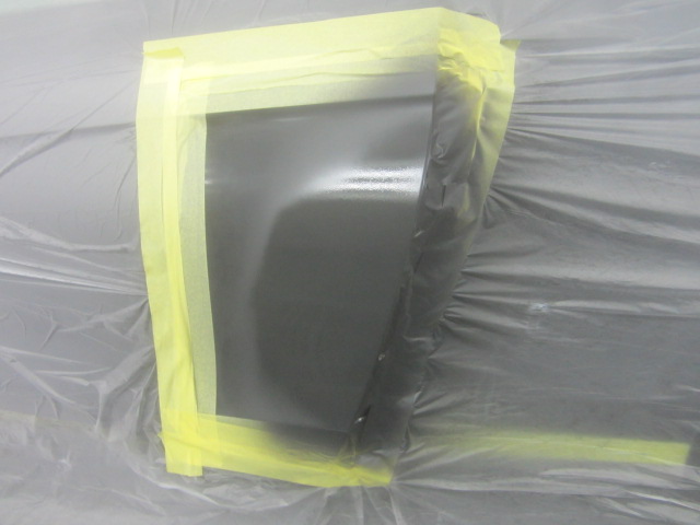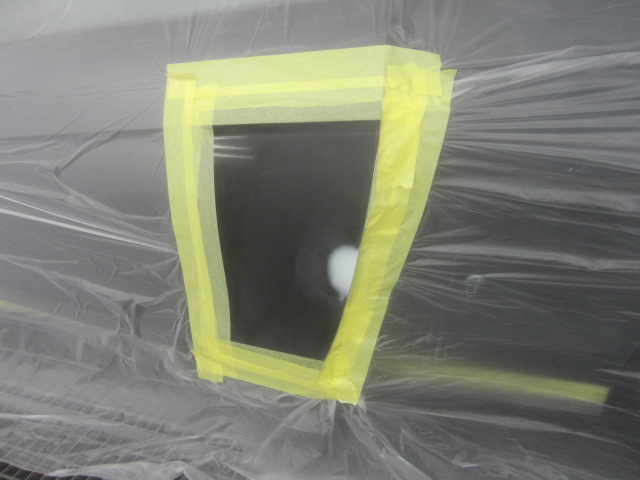 パテ乾燥の後、サンディング作業、マスキング作業、脱脂作業、エアブローを行い、