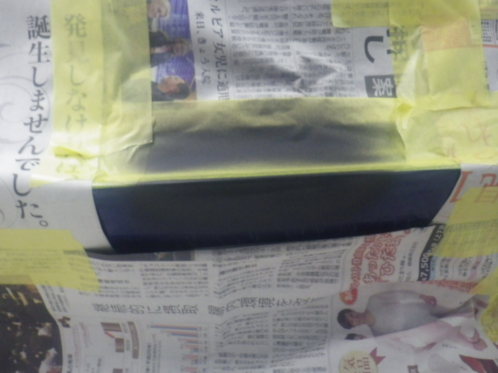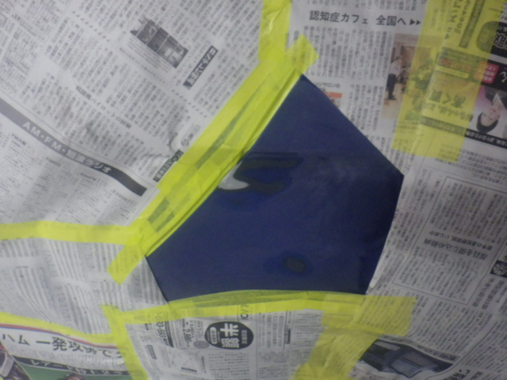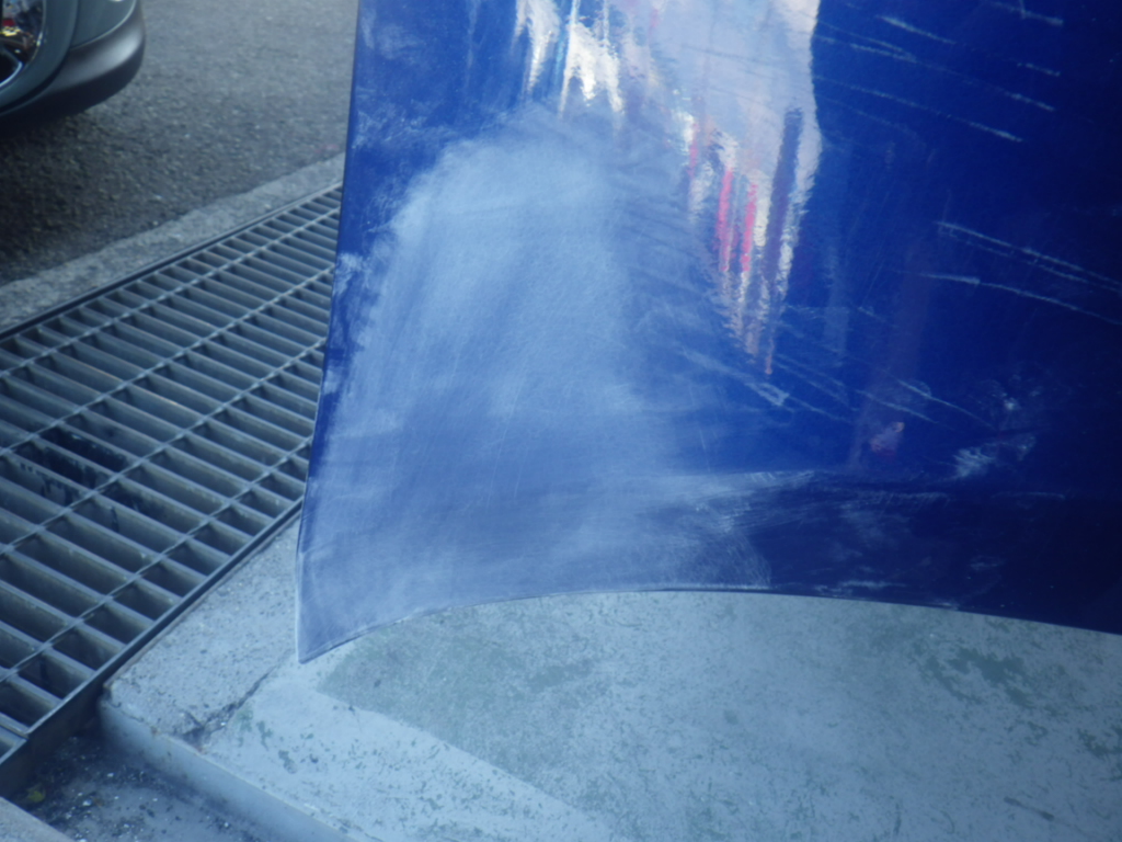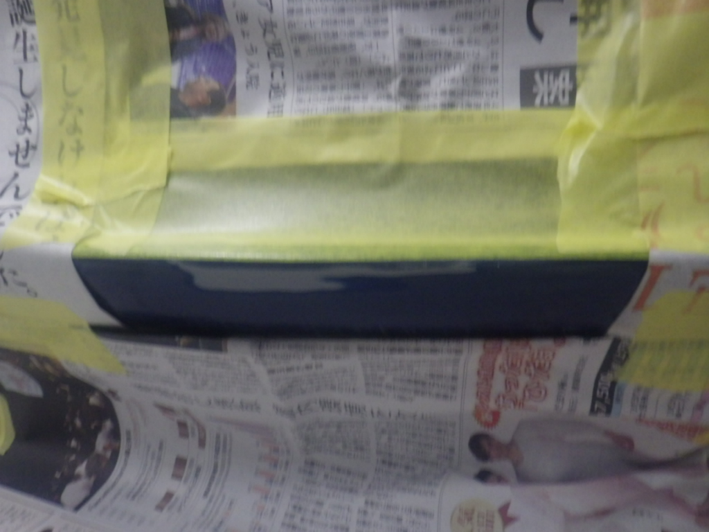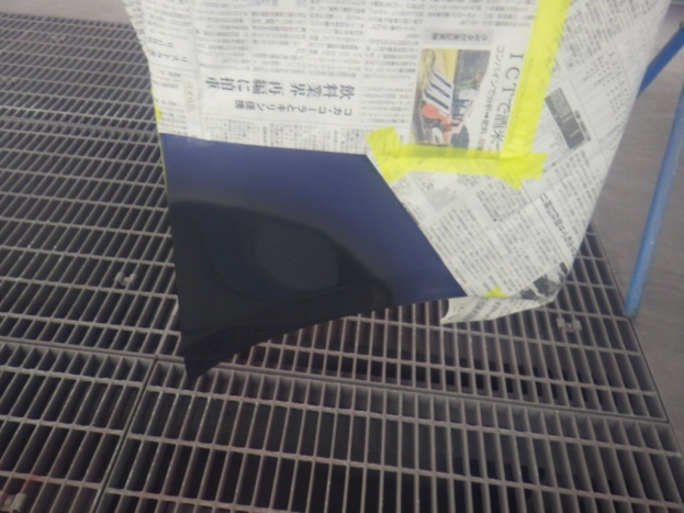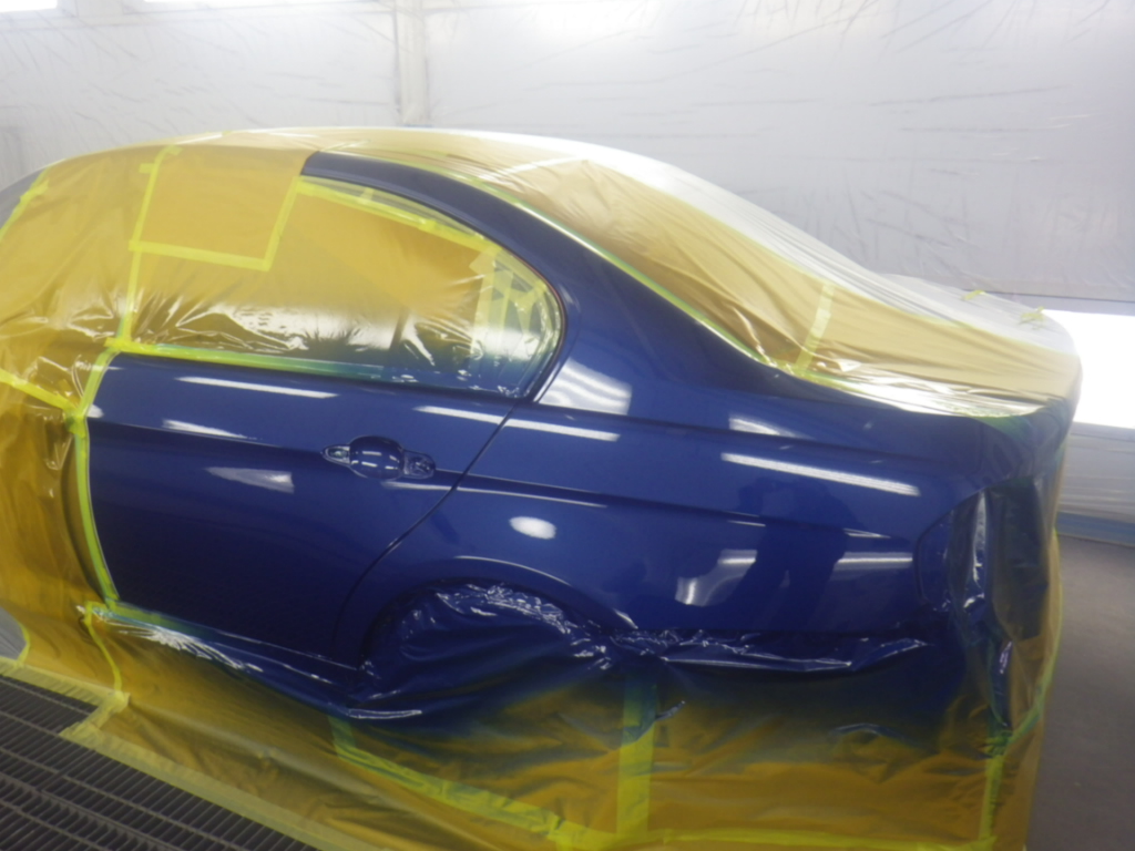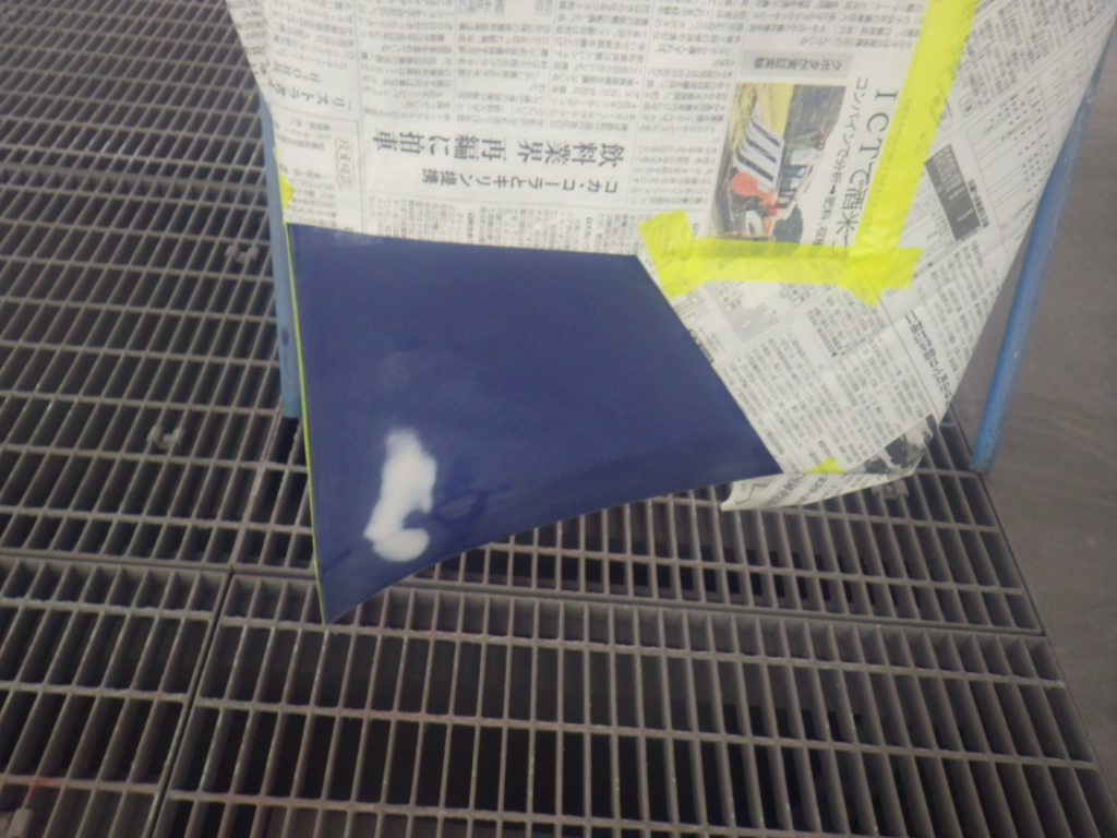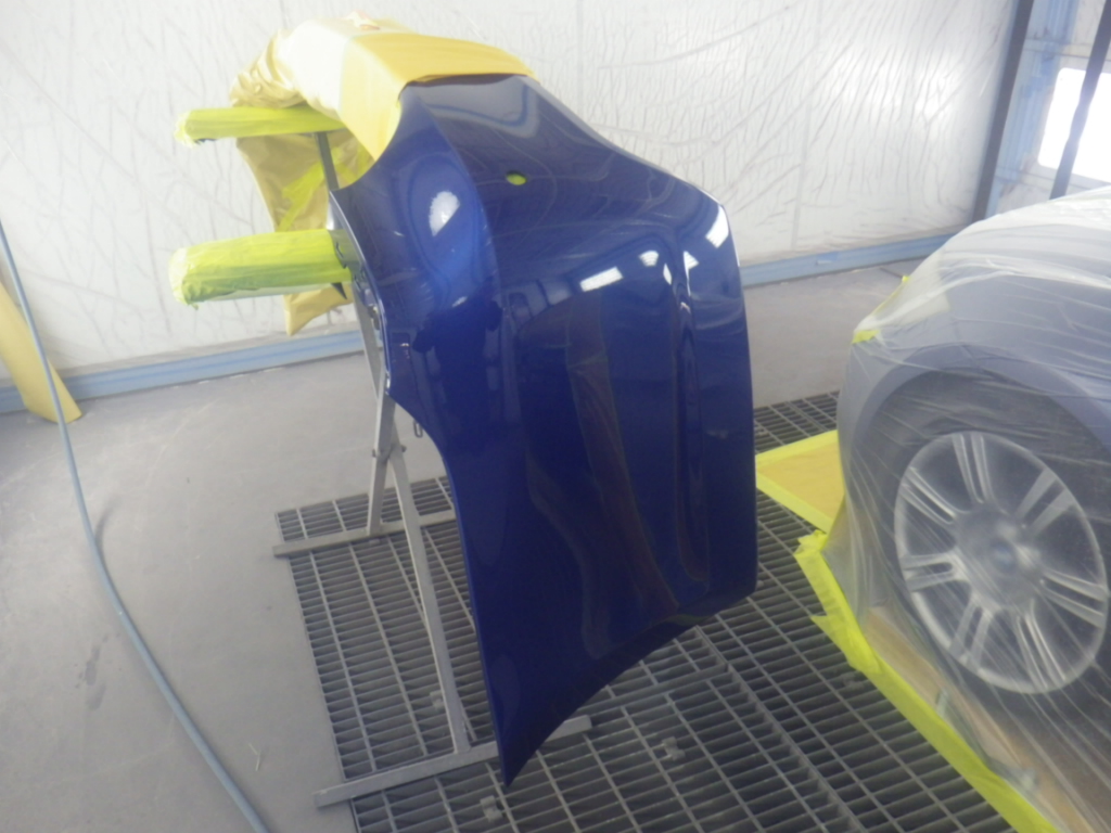 サフェーサーの塗布作業の後、塗装準備(足付け、マスキング、脱脂、エアブロー)を行い、ベースコート(青)、トップコート(クリヤー)の順に塗装作業を行いました。