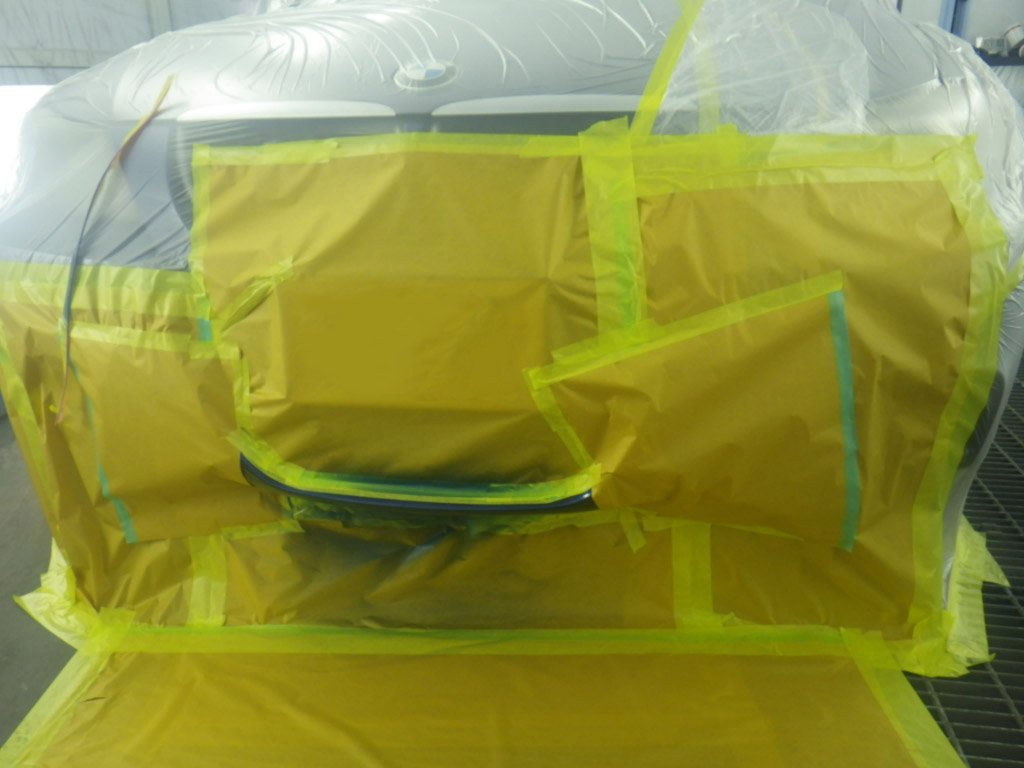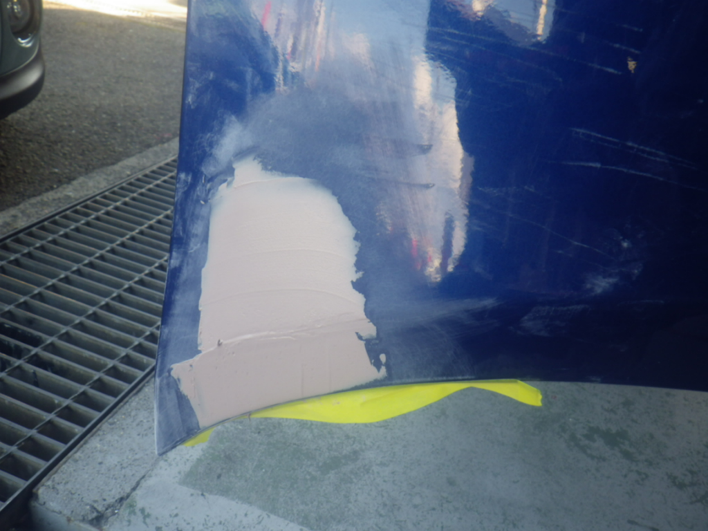 パテ乾燥の後、サンディング作業、マスキング作業、脱脂作業、エアブローを行い、