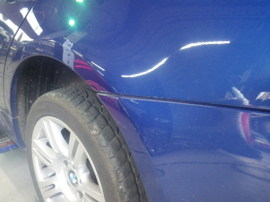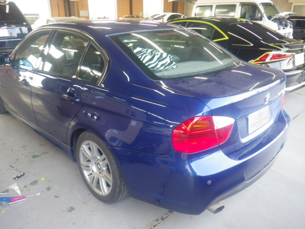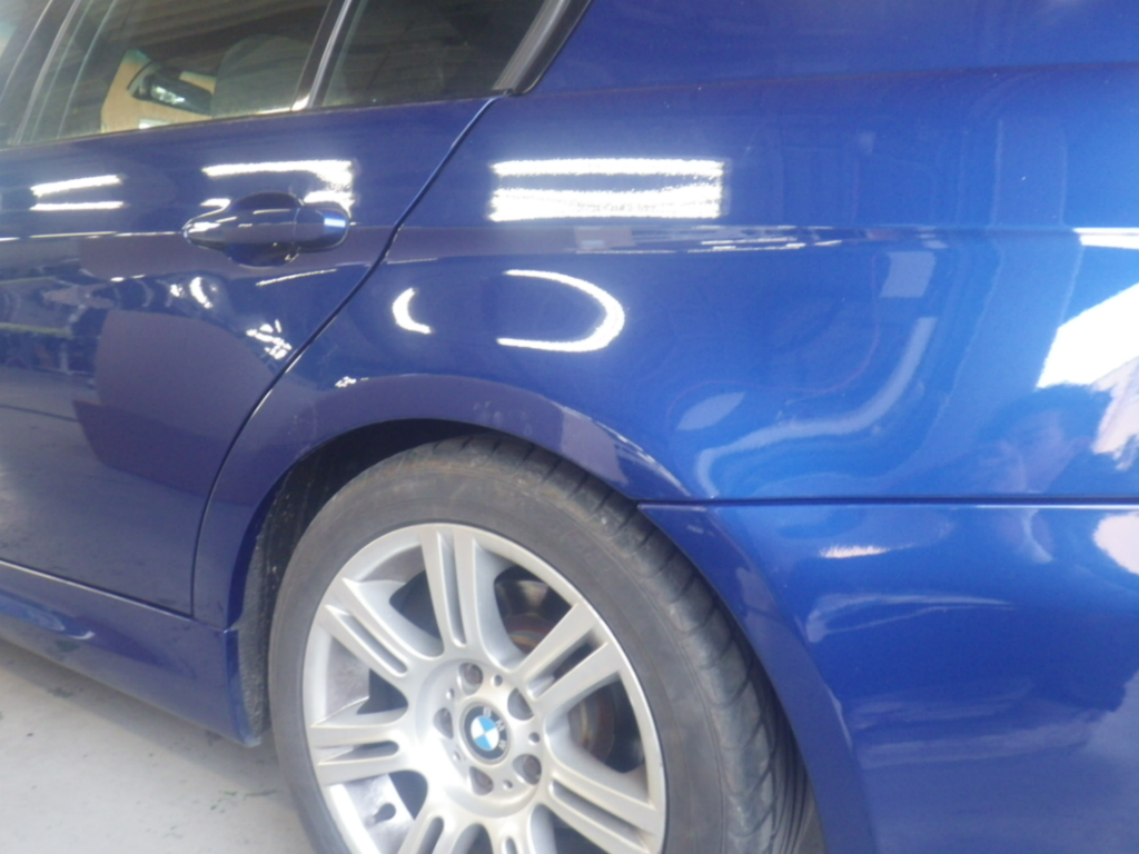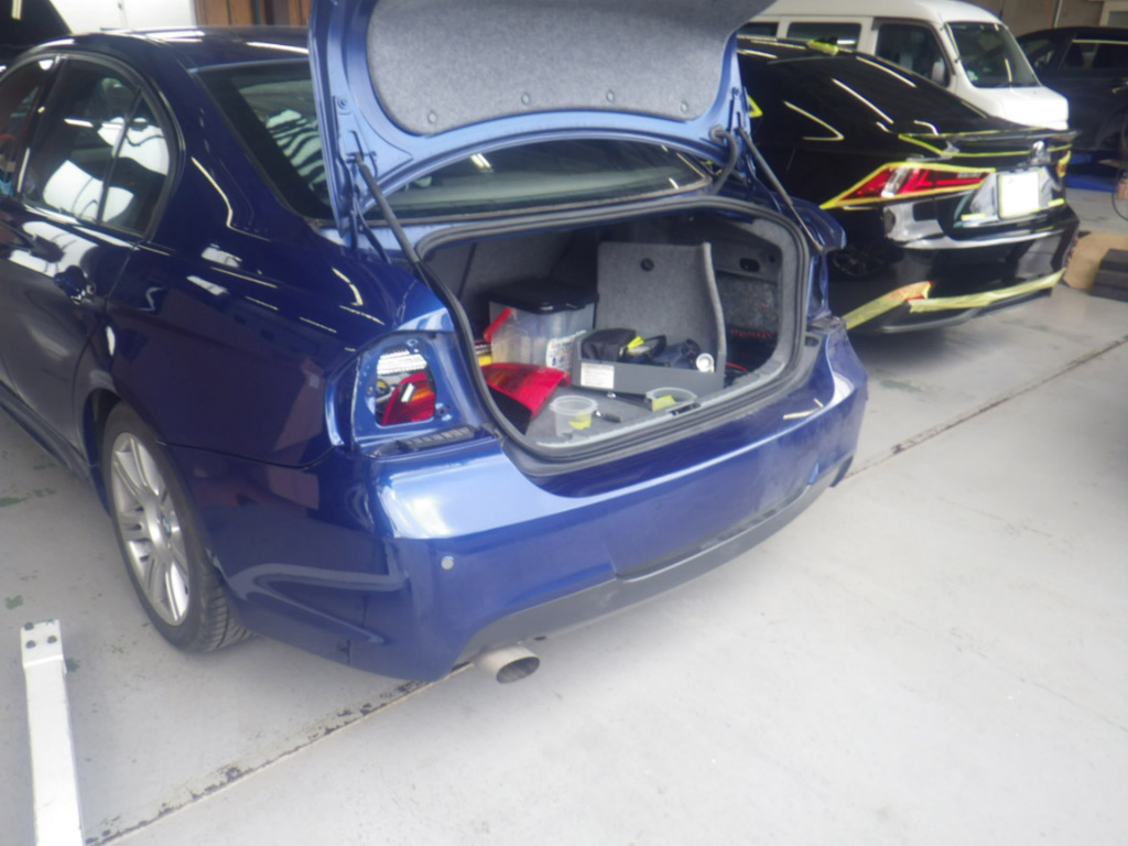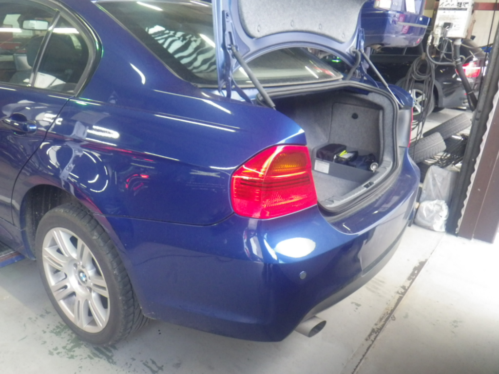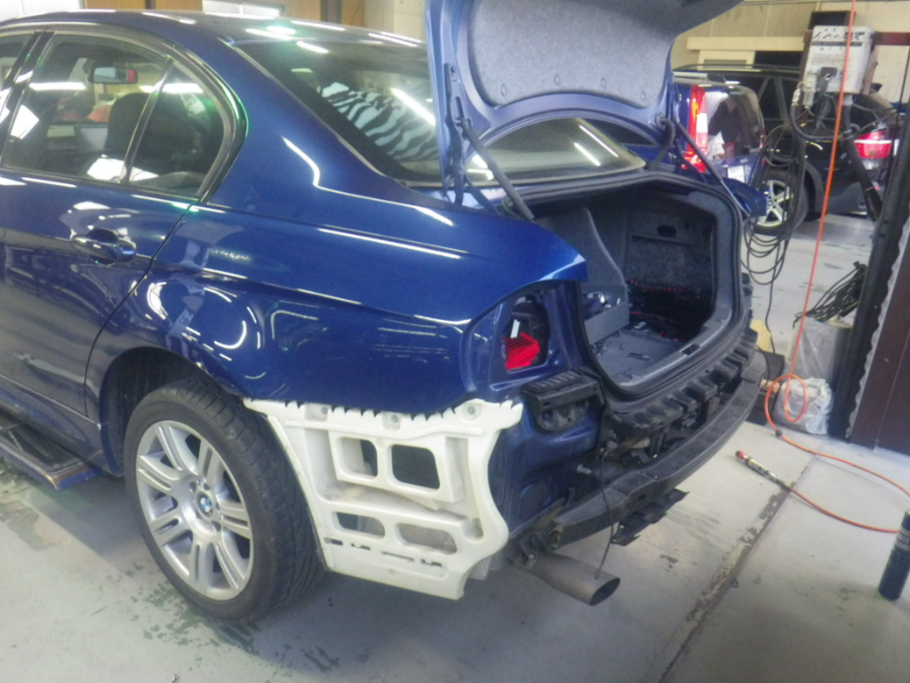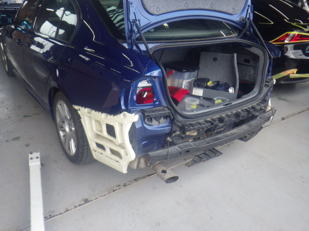 【鈑金塗装】【事故】兵庫県神戸市、T様、2006y、BMW、3シリーズ(E90)、リアバンパーリアフェンダー鈑金修理レポートです!有難うございました
