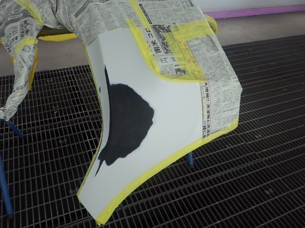サフェーサー乾燥の後、足付け作業、マスキング作業、脱脂作業、エアブローを行い、