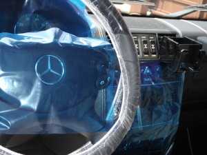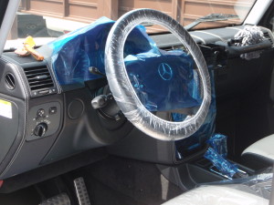 フロント足廻り損傷でのお預かりになります。 入庫後、入庫確認作業を行い、キズ、汚れ防止の為、ハンドルカバー、 シートカバーの取り付けを行いました。 入庫確認の後…