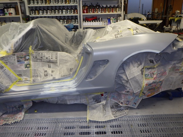 サフェーサー乾燥の後、足付け作業、マスキング作業、脱脂作業、エアブローを行い、