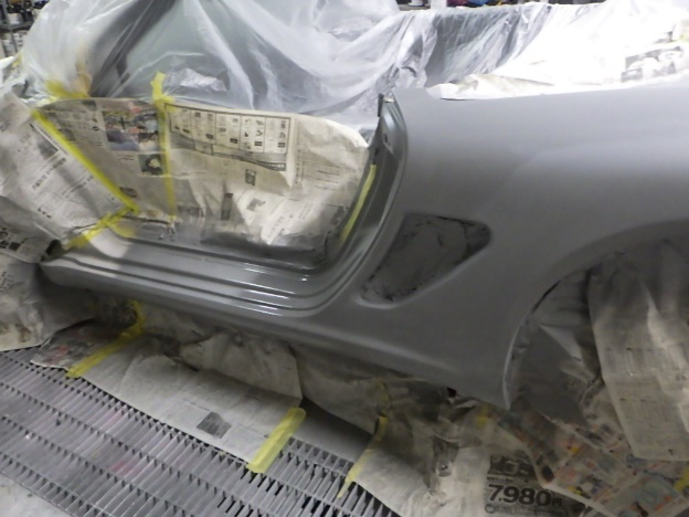 パテ乾燥の後、サンディング作業、マスキング作業、脱脂作業、エアブローを行い、