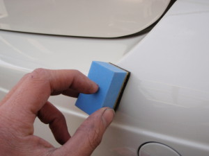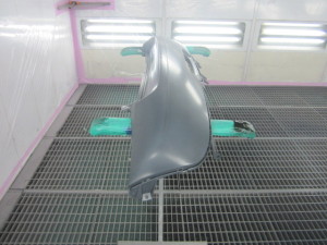 新品バンパーの足付け作業、脱脂作業、エアブローを行い、
