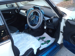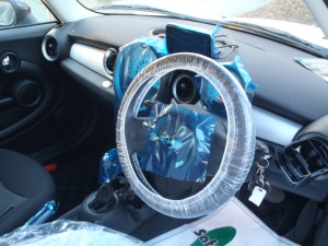 入庫時確認作業の後、室内のキズ汚れ防止の為に、ハンドル、シートカバー、