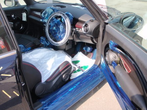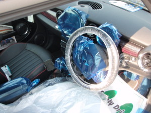 入庫時確認作業の後、室内のキズ汚れ防止の為に、ハンドル、シートカバー、
