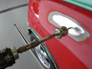 板金作業の後、マスキング作業、脱脂作業、エアブローを行い、