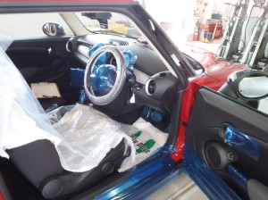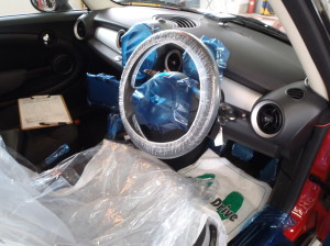 入庫時確認作業の後、室内のキズ汚れ防止の為に、ハンドル、シートカバー、