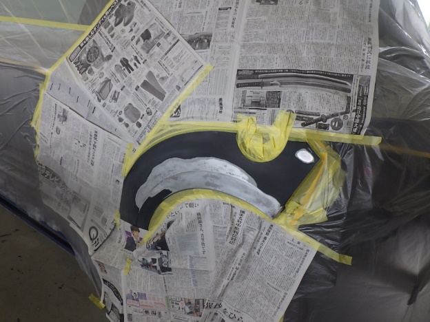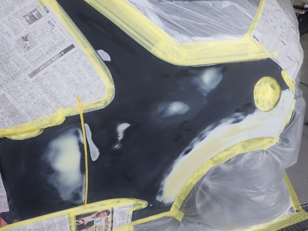パテ乾燥の後、サンディング作業、マスキング作業、脱脂作業、エアブローを行い、