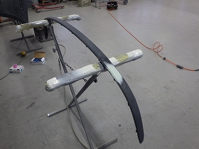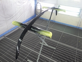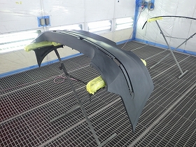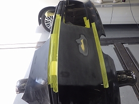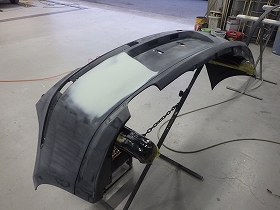パテ付け作業の後、サンディング、塗装準備(足付け、脱脂、エアブロー)を行い、