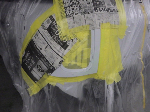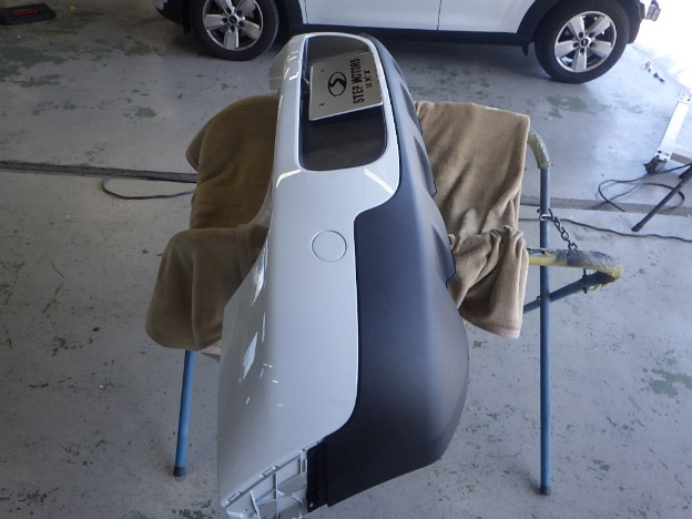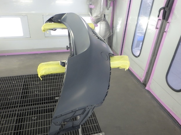 新品バンパーの足付け作業、脱脂作業、エアブローを行い、
