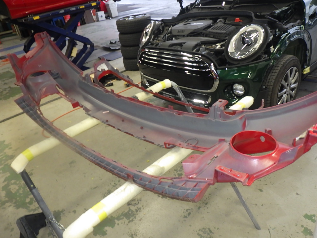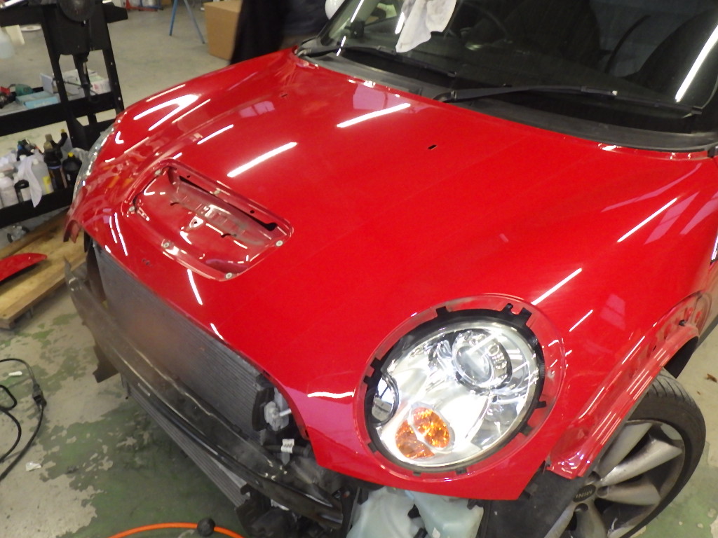【鈑金塗装】【事故】奈良県、I様、2011y、MINI、R56、フロントバンパーボンネット損傷へこみ修理レポートです!ありがとうございました。