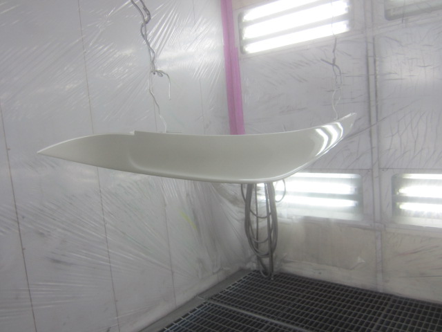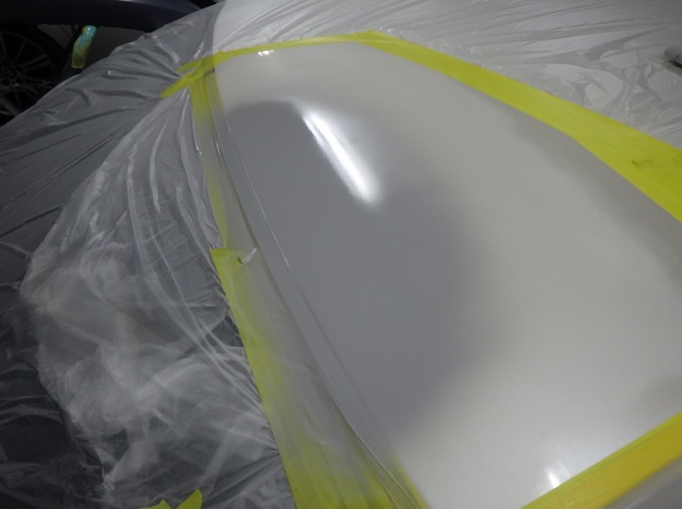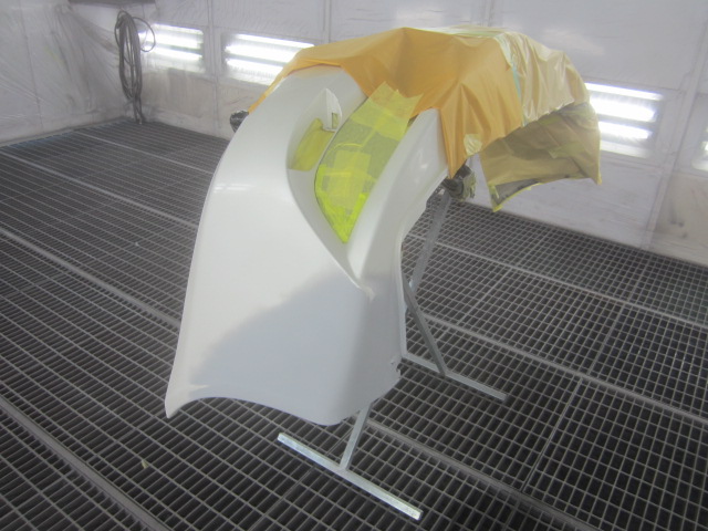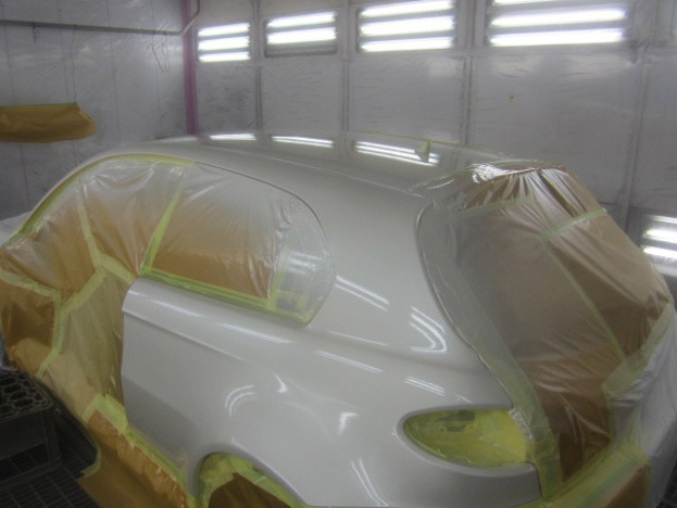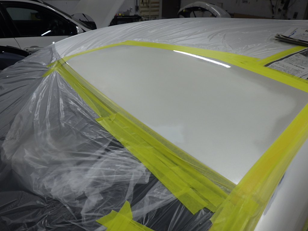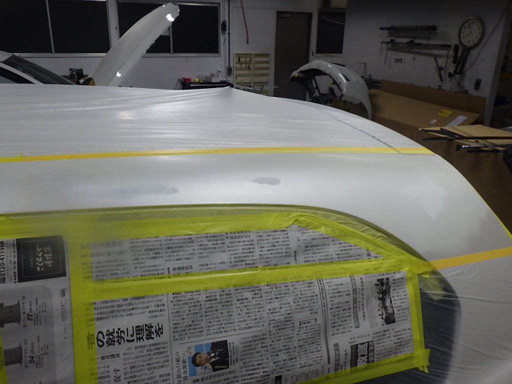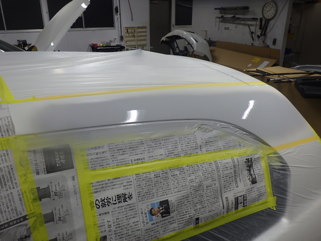 ベースコート(白)、2コート(パール)、トップコート(クリヤー)の順に塗装作業を行いました。
