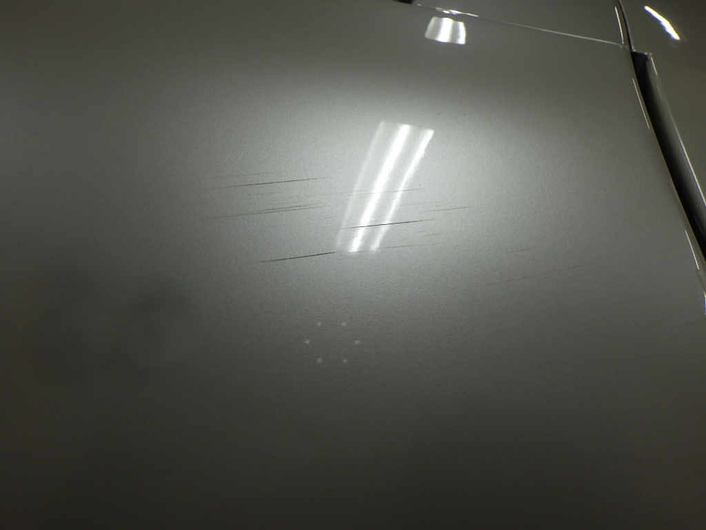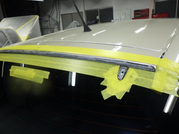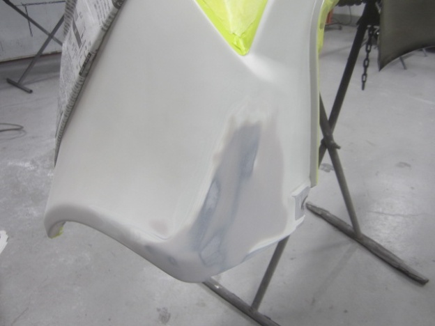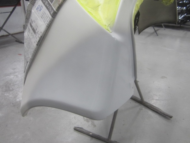 パテ乾燥の後、サンディング作業、マスキング作業、脱脂作業、エアブローを行い、