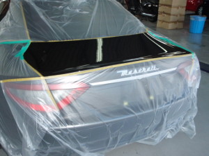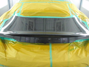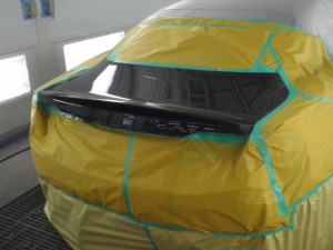トランク付属品の取外し作業の後、塗装ブース内に入れ、マスキング作業シリコンオフで脱脂、エアブローして、塗装作業開始です。