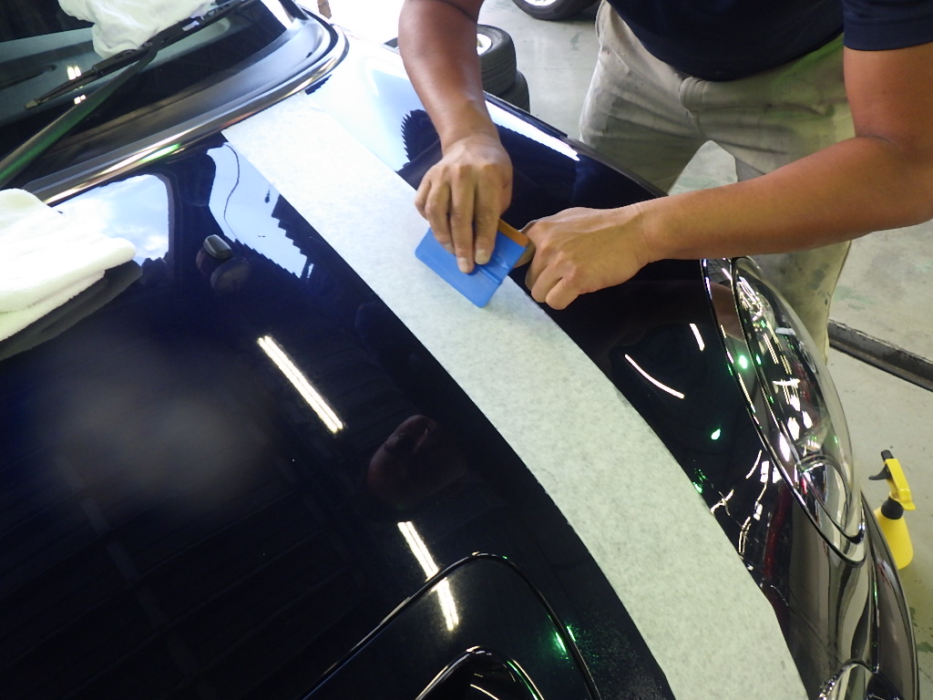 磨き作業の後、ストライプ貼り付け作業、コーティング施工、各種チェックを行い、