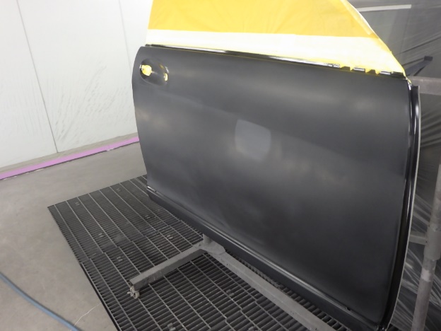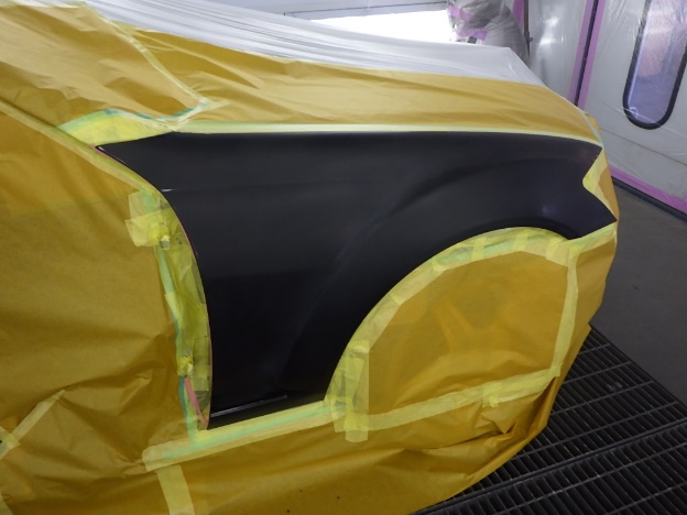 分解作業の後、修正作業を行い、塗装準備(足付け、マスキング、脱脂、エアブロー)を行い、サフェーサーの塗布作業を行いました。