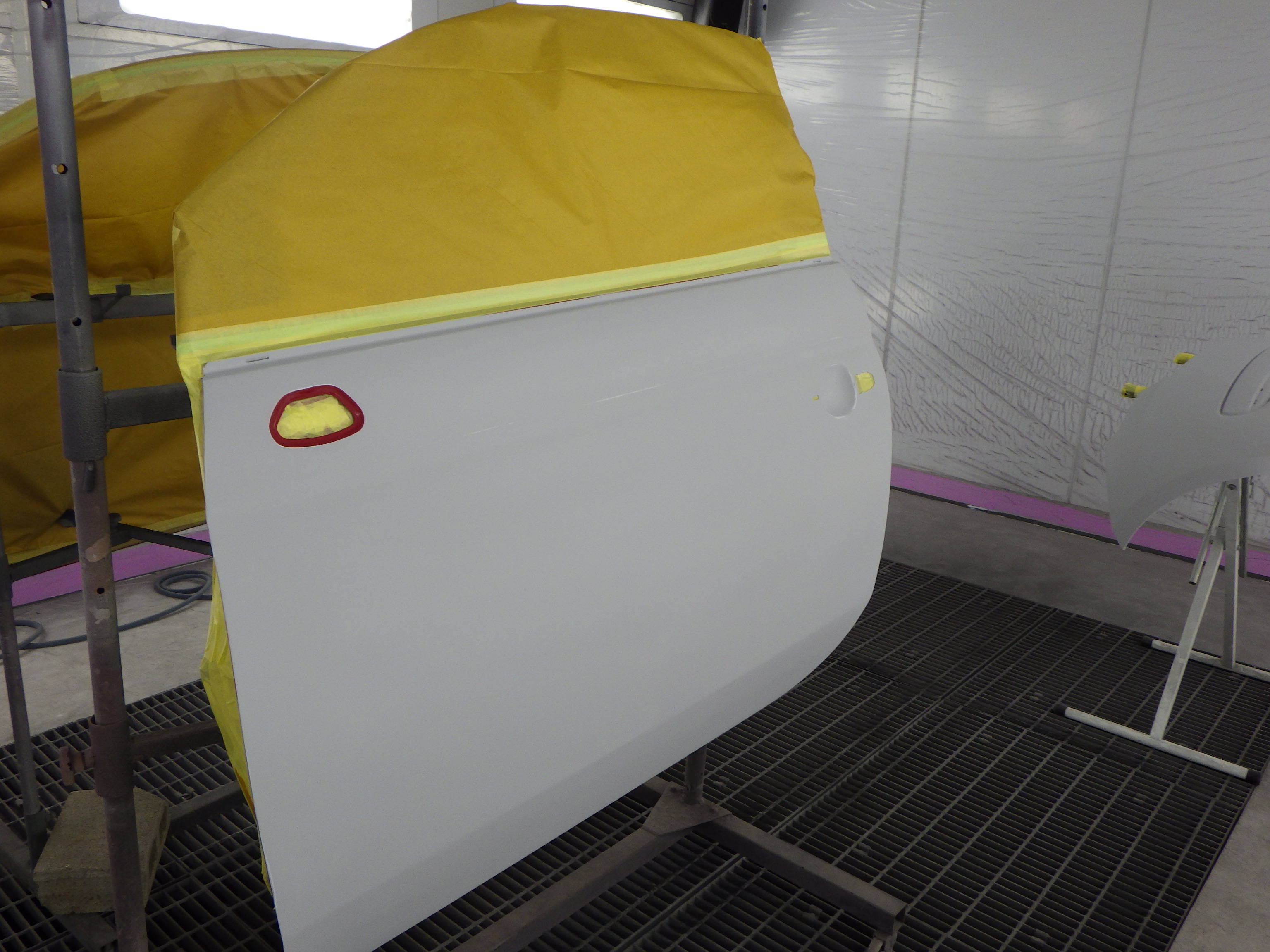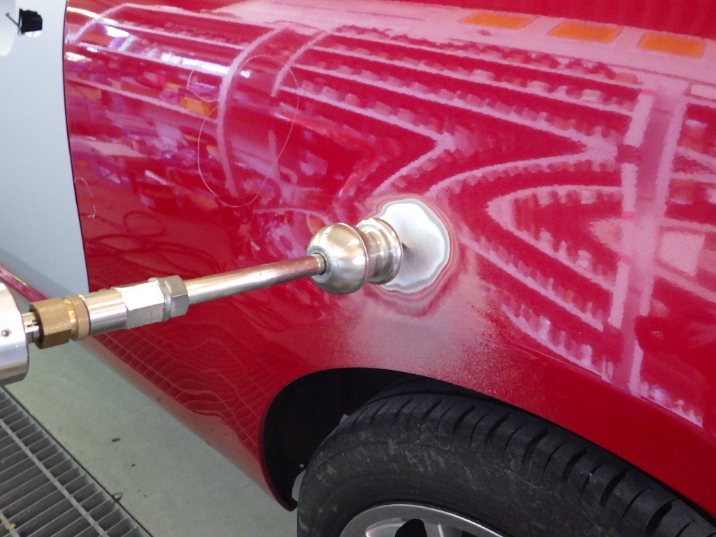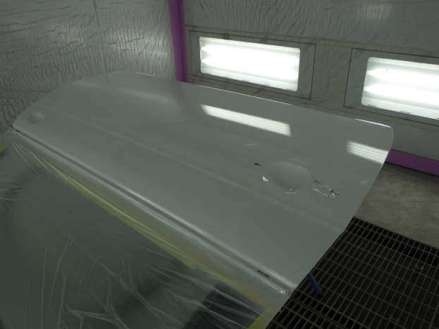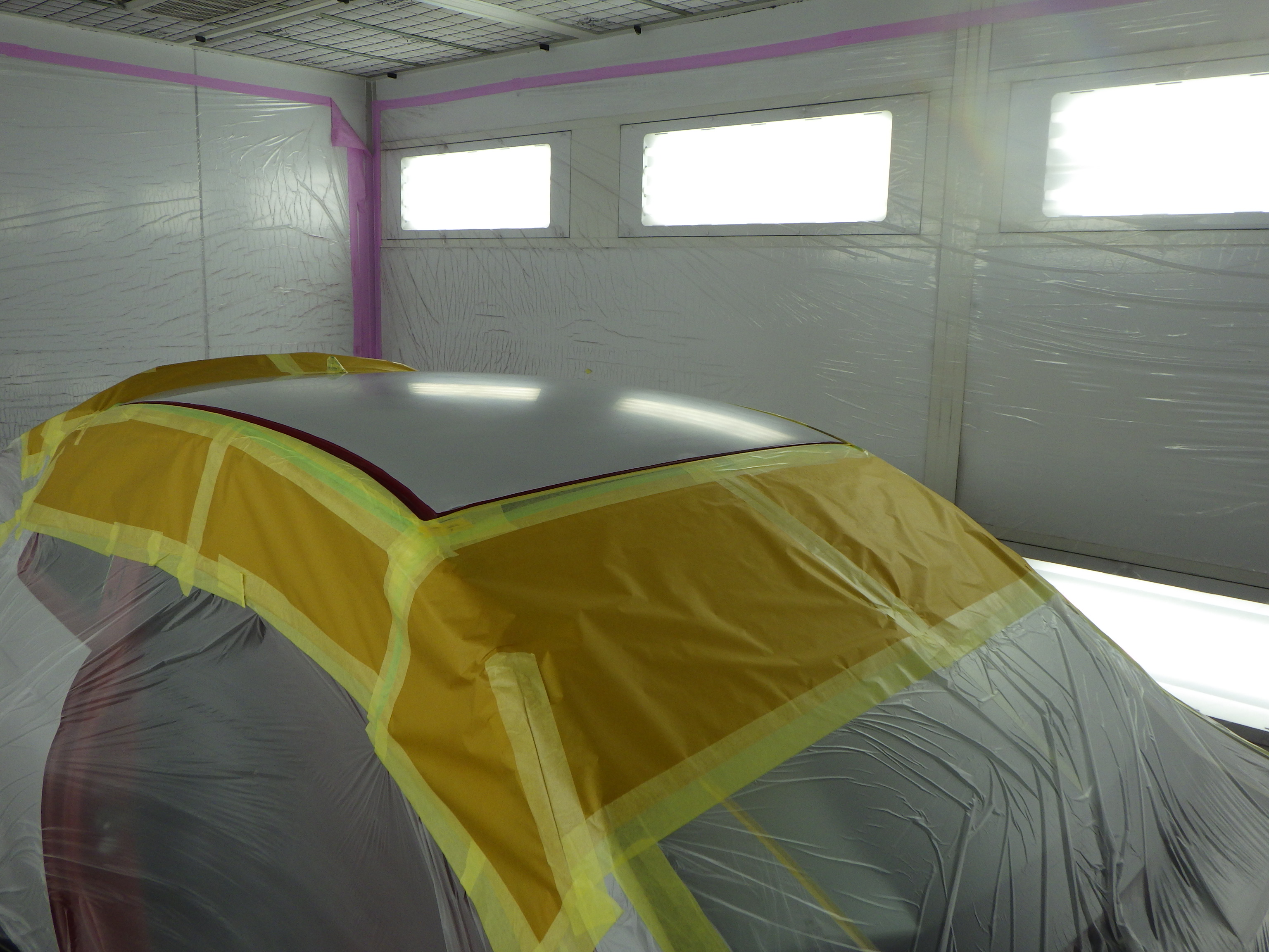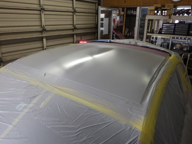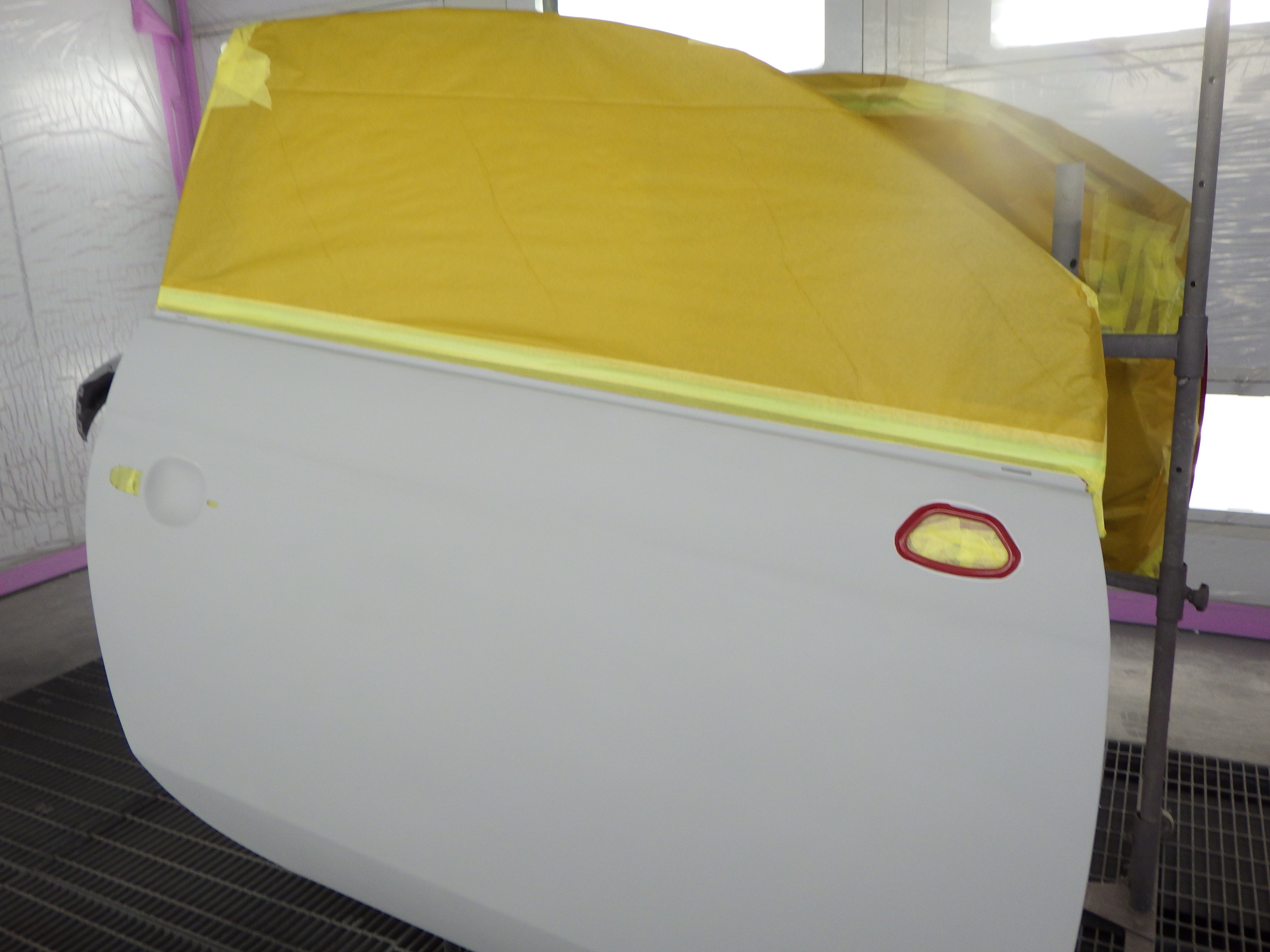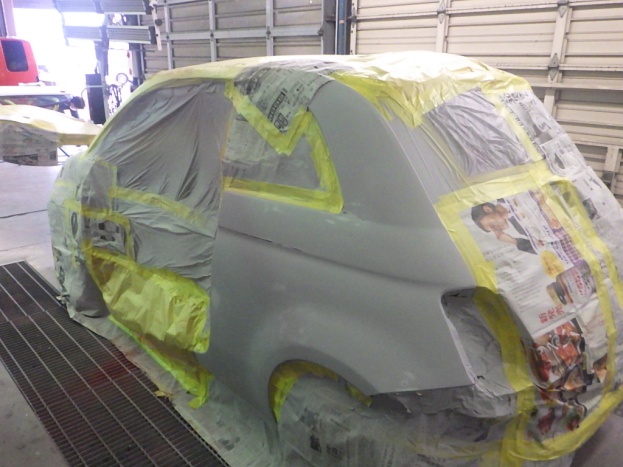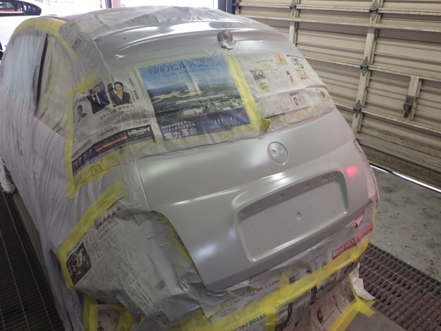 板金作業の後、全面のサンディング、修正作業、マスキング作業、脱脂作業、エアブロー、