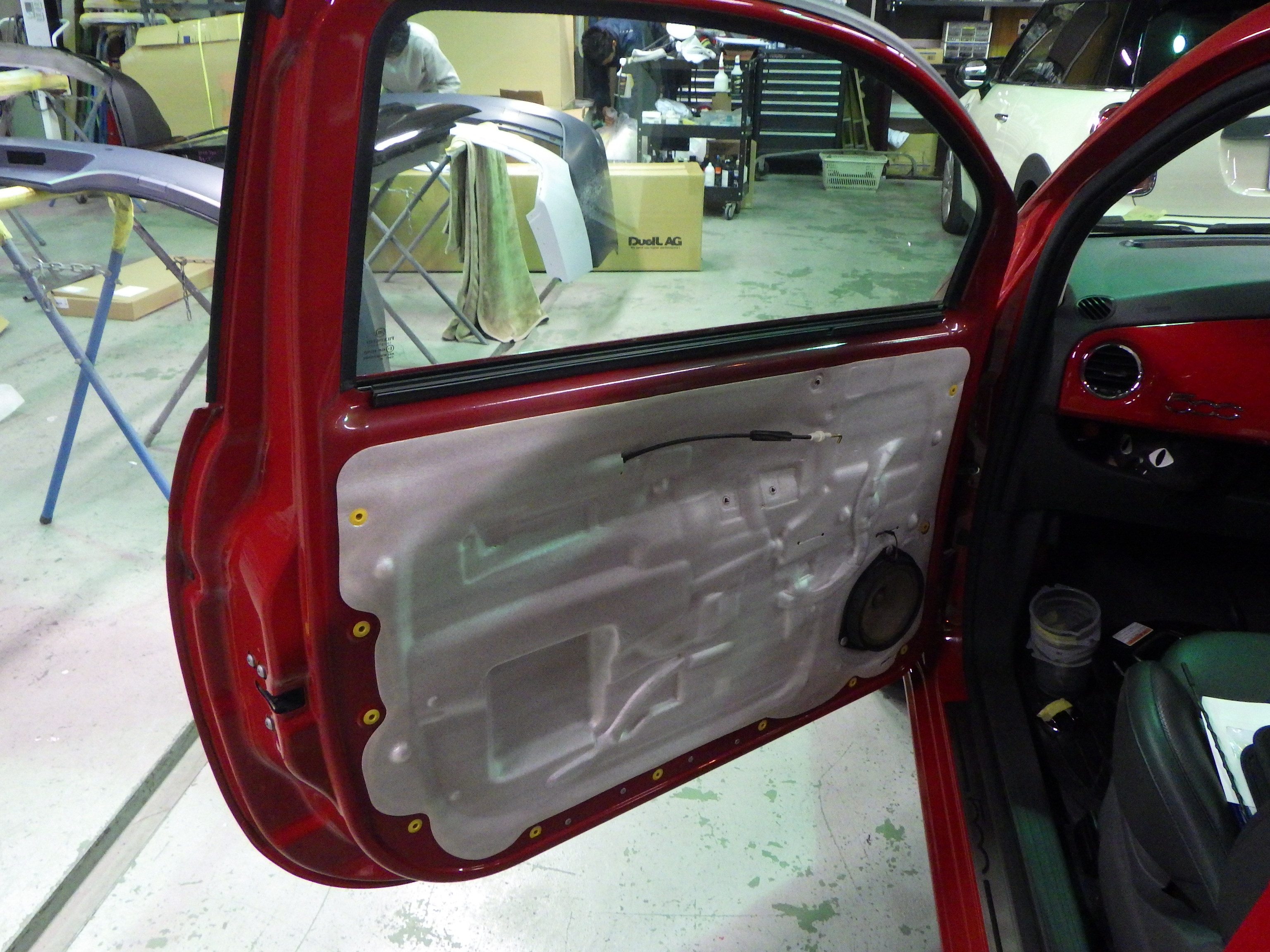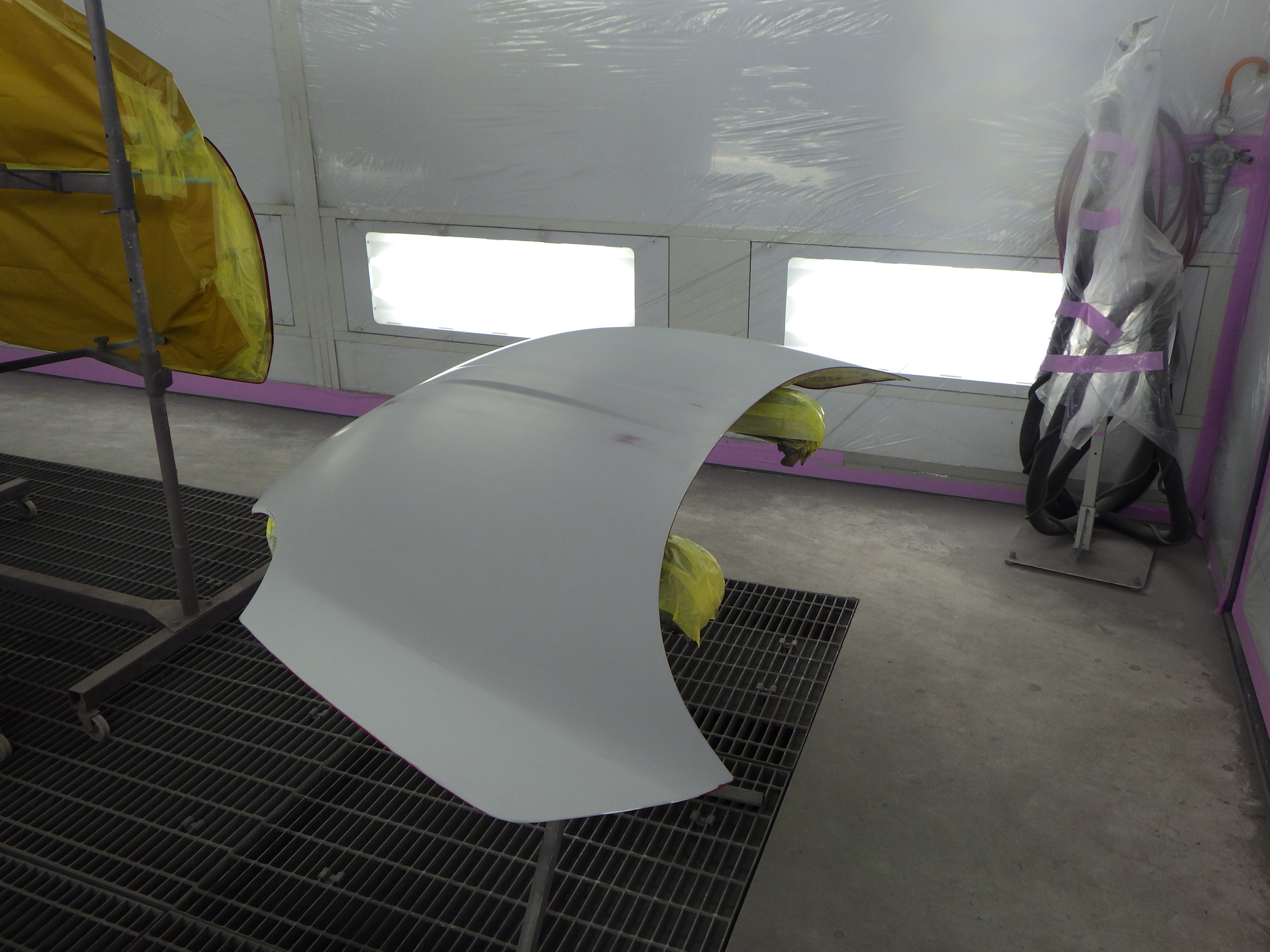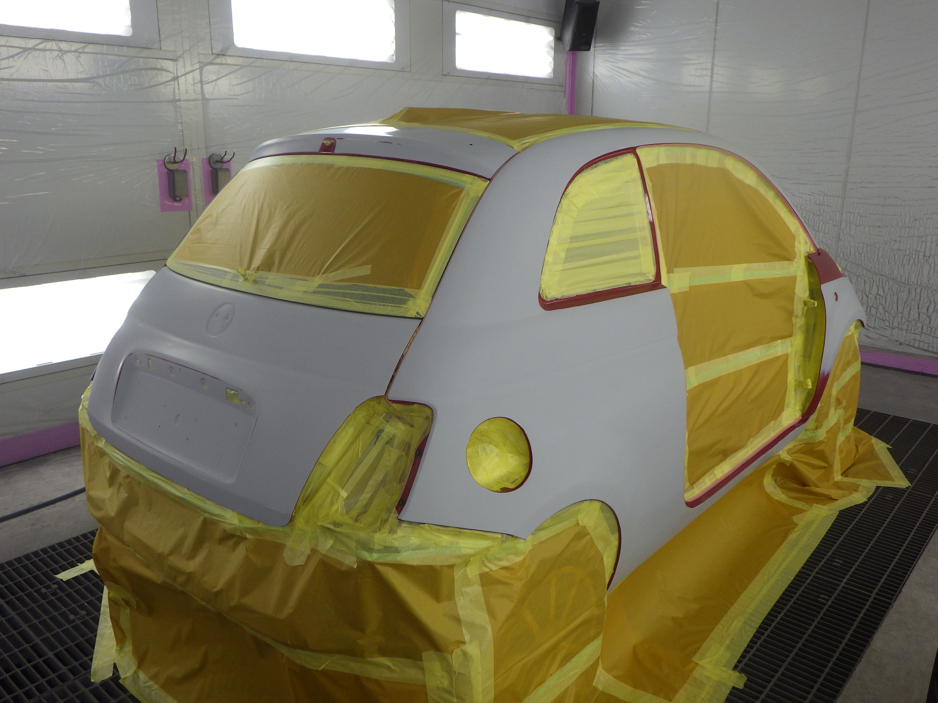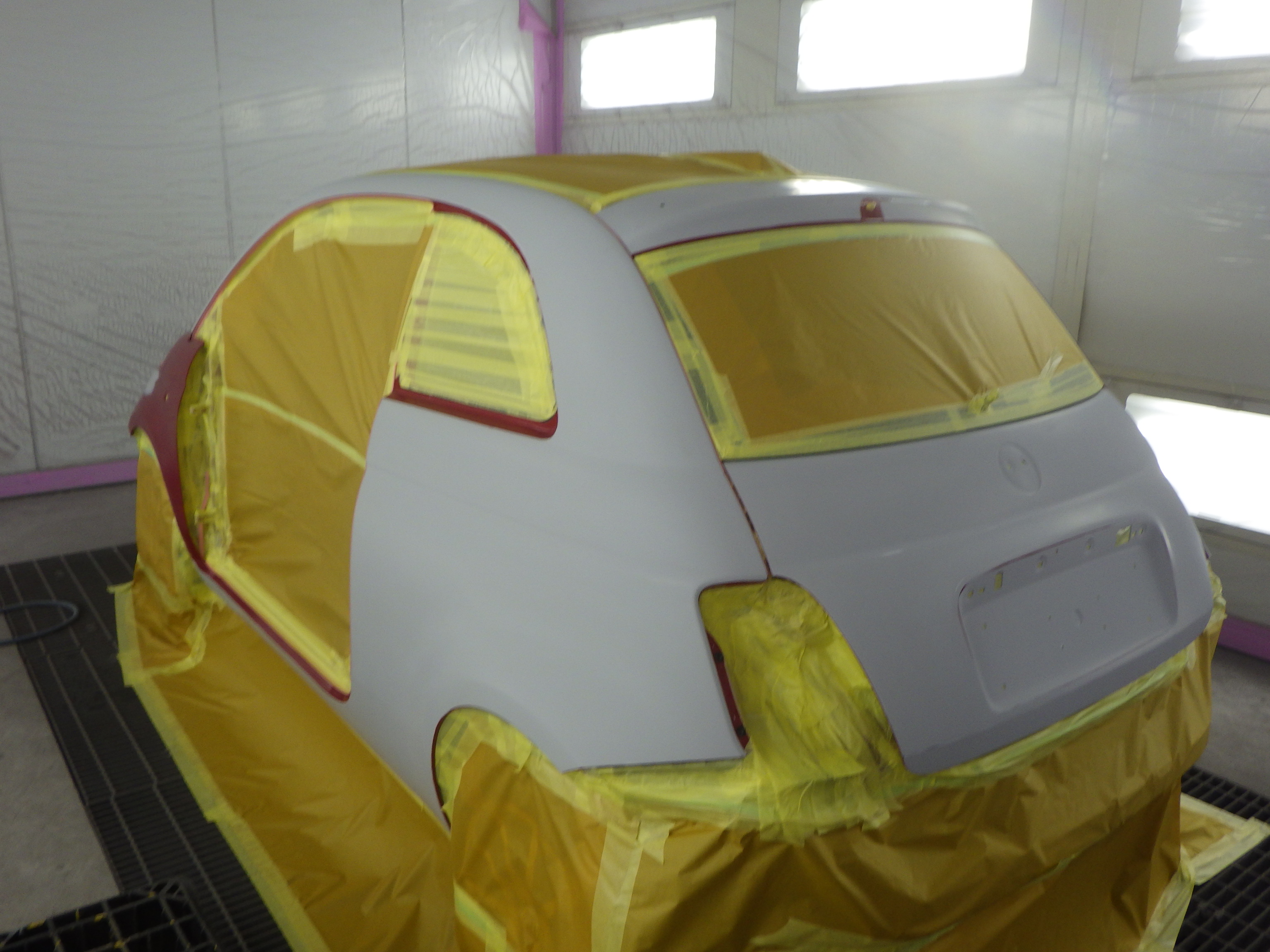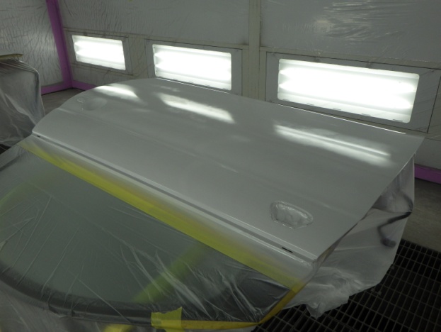 板金作業の後、全面のサンディング、修正作業、マスキング作業、脱脂作業、エアブロー、