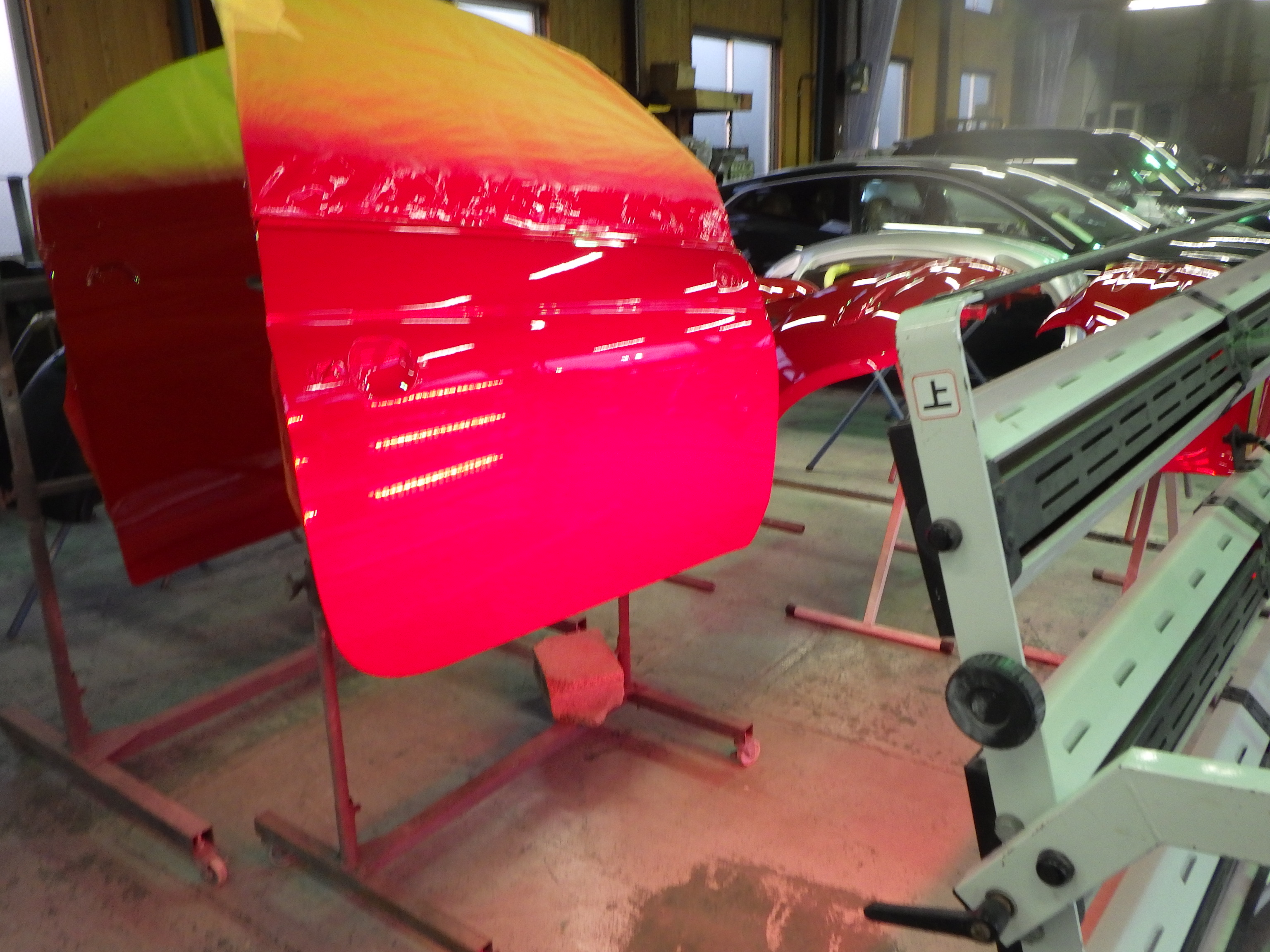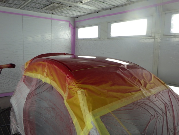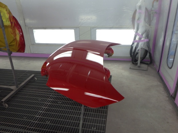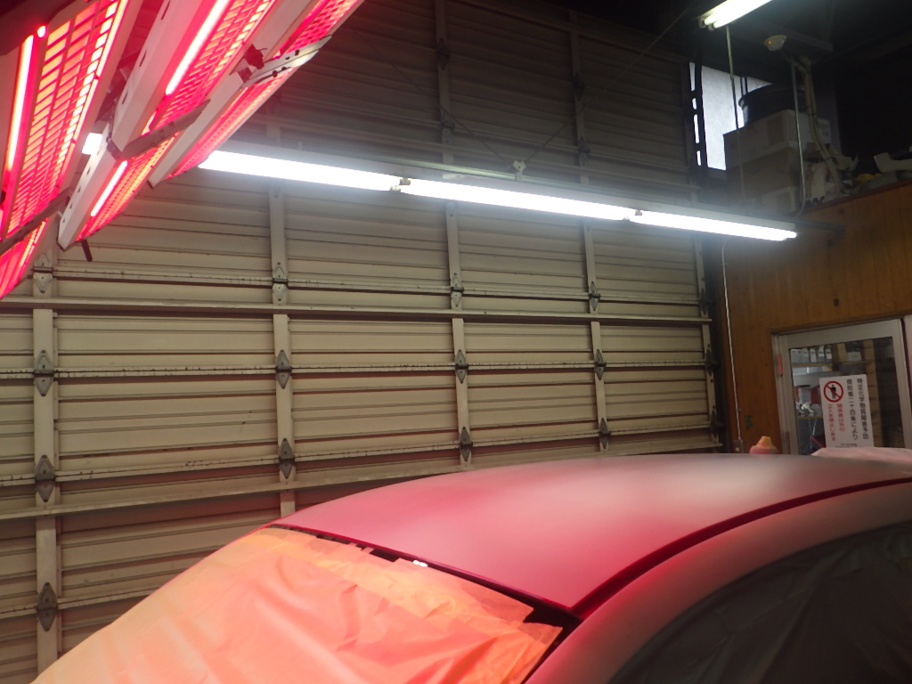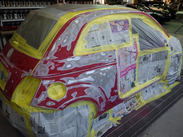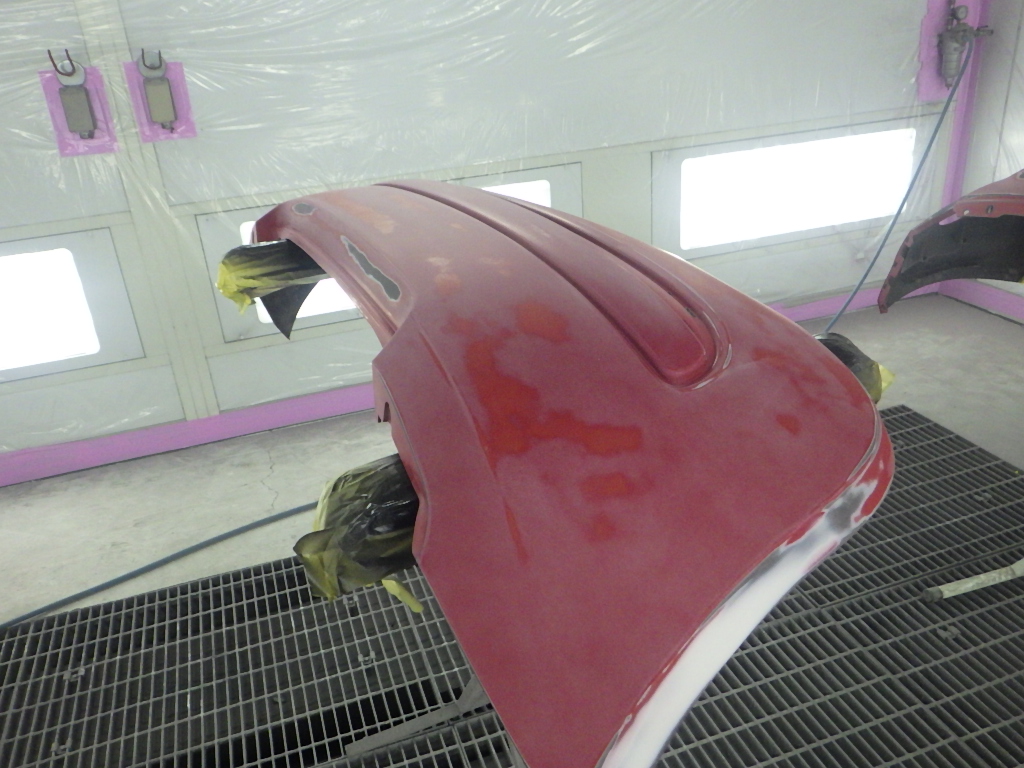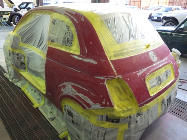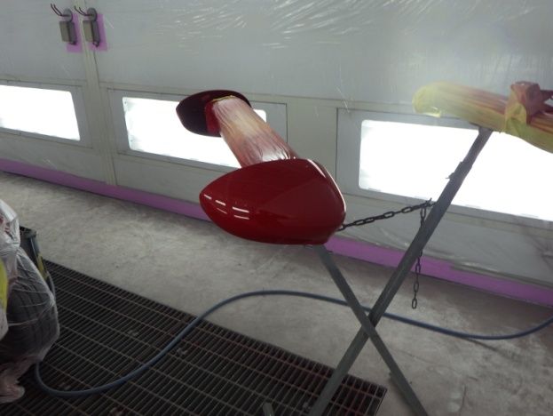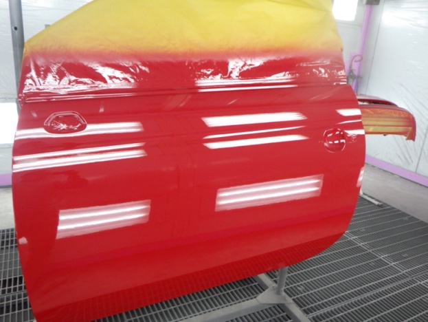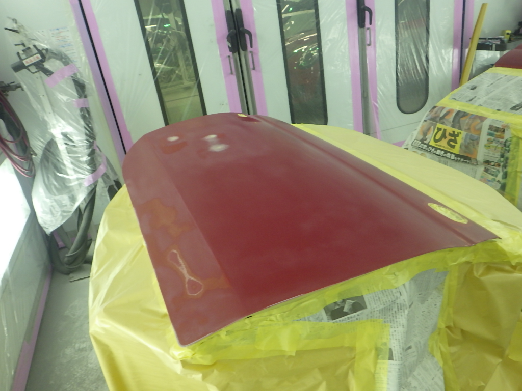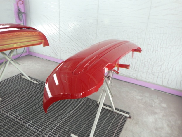 ベースコート(赤)、トップコート(クリヤー)の順に塗装作業を行いました。