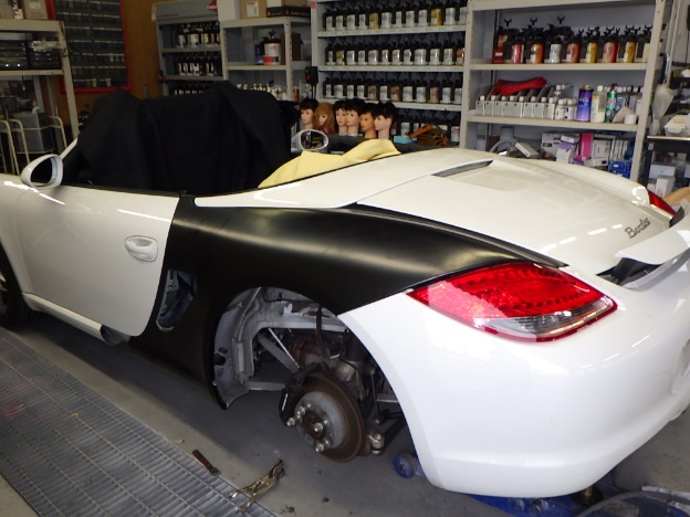 パテ乾燥の後、サンディング作業、マスキング作業、脱脂作業、エアブローを行い、
