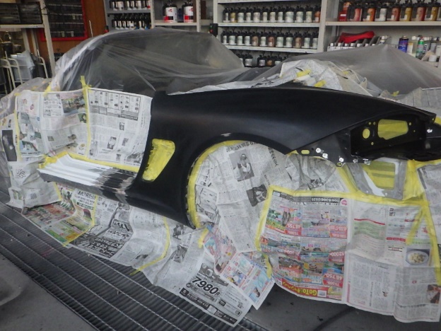 サフェーサー乾燥の後、足付け作業、マスキング作業、脱脂作業、エアブローを行い、
