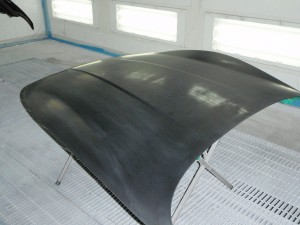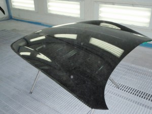 ボンネットの飛び石修正後、足付け作業を行い、塗装時のオーバーミスト、油分・水分による塗膜の欠陥防止為、養生作業と脱脂作業を行い、塗装開始です。