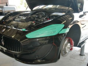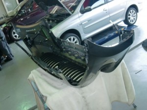 ヘッドライトにキズが入らない様にマスキングを行った後、フロントバンパー取外し、分解作業を行いました。
