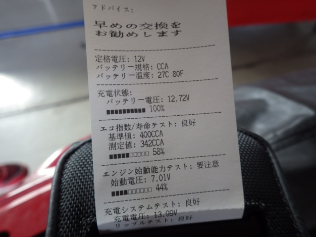 バッテリーはテスターにて診断しましたが、少し弱ってきていますので早めの交換をおすすめします。