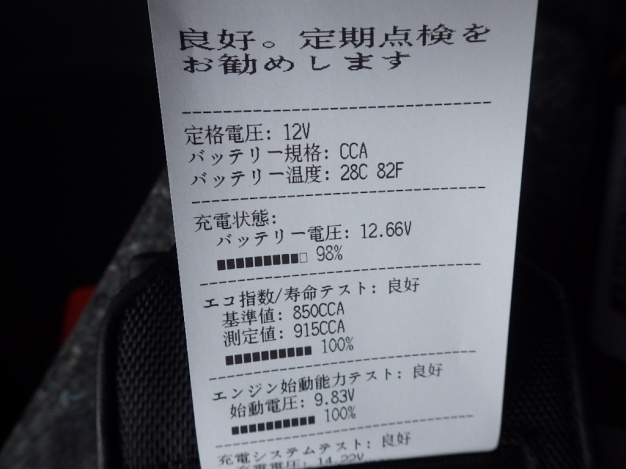 バッテリーはテスターにて診断しましたが異常ありませんでしたが、バッテリー上がり歴があり、使用年数も長くなっていますので早めの交換をおすすめします。