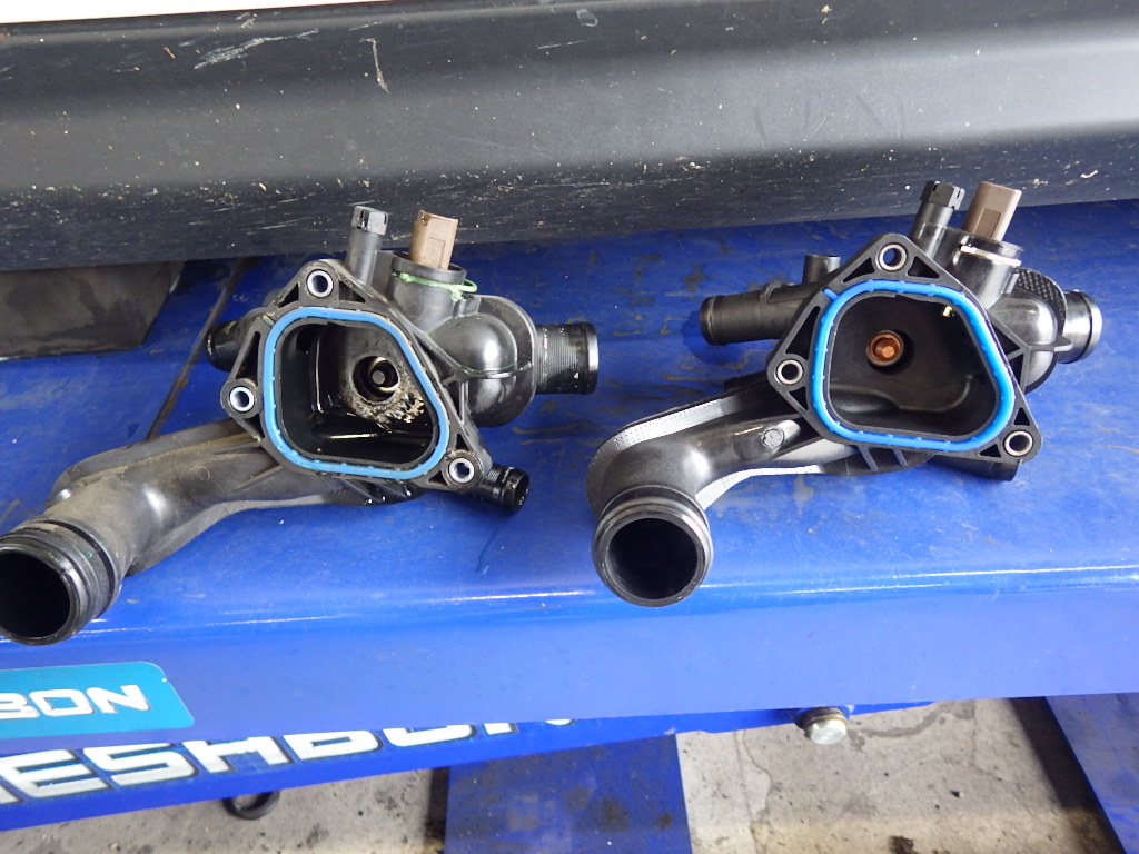 サーモハウジングより冷却水が漏れていましたのでサーモハウジングを交換しました。左側が交換前のサーモハウジング、右側が新品のサーモハウジングになります。