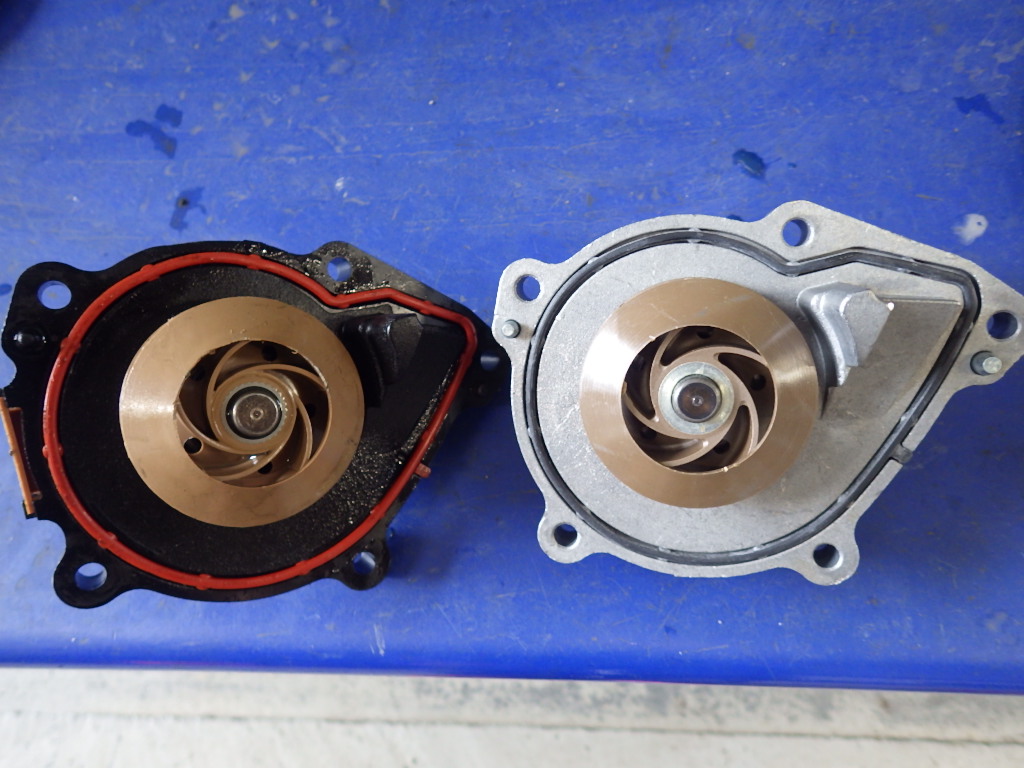 ウォーターポンプより冷却水が漏れていましたのでウォーターポンプを交換しました。左側が交換前のウォーターポンプで、右側が新品のウォーターポンプになります。