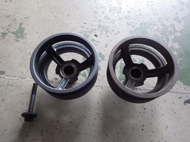 右側が交換前のクランクプーリー、左側が新品のクランクプーリーになります。併せて取付けボルトも交換しました。