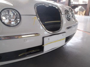 ヘッドライトブラケット塗装完了後、もう一度フロントバンパーの仮合わせ作業を行いヘッドランプの位置調整確認後、