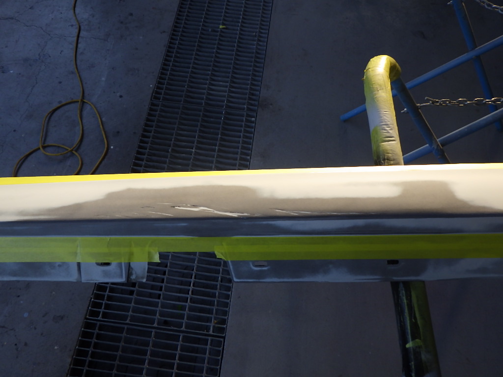 パテ乾燥の後、サンディング作業、マスキング作業、脱脂作業、エアブローを行い、